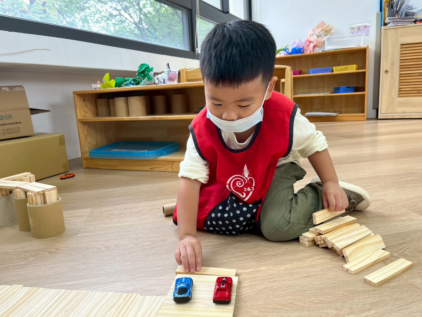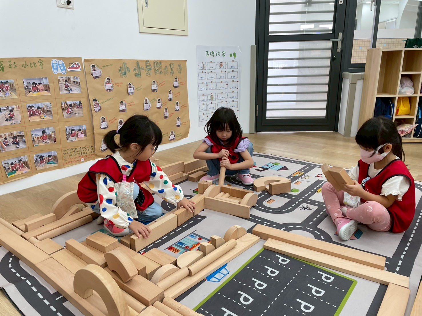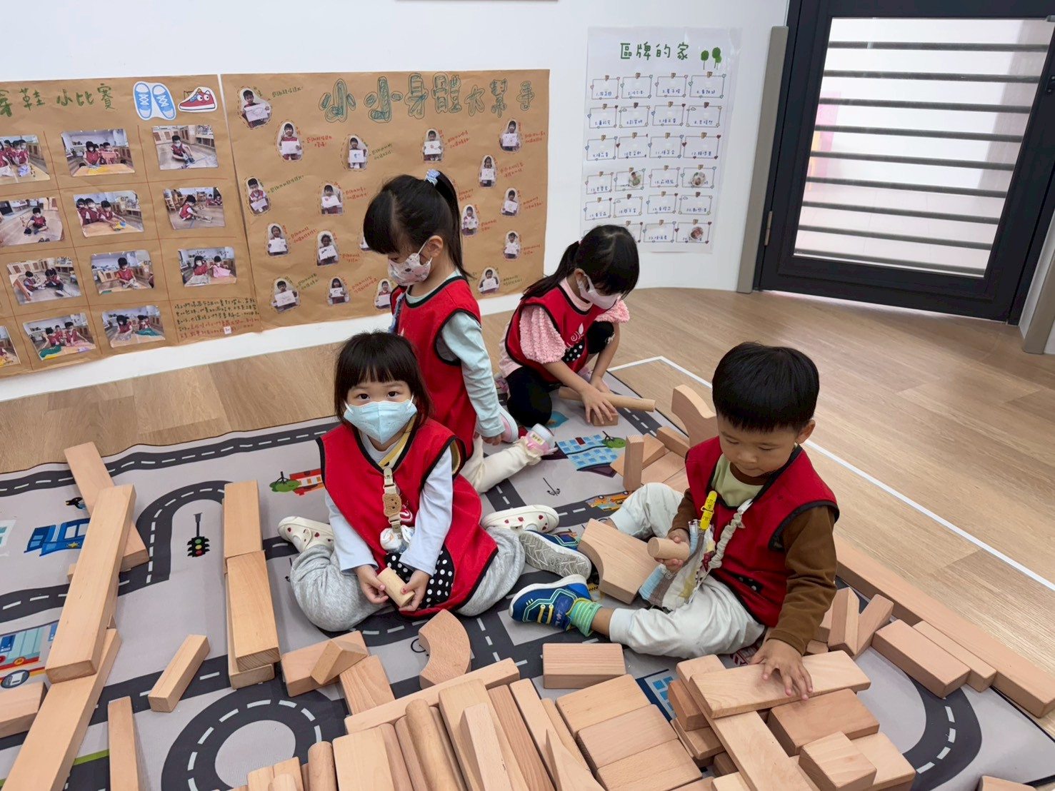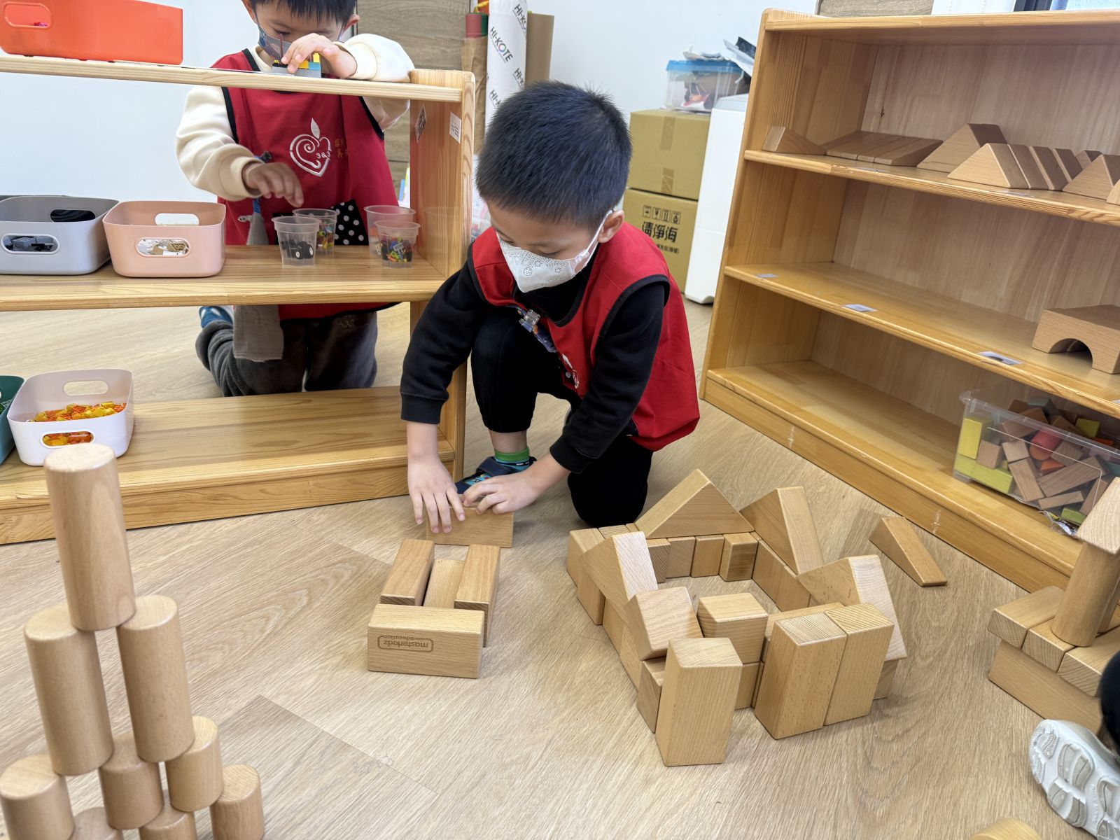孩子透過操作體積較大的木頭積木,在搬運、堆疊與建構的過程中,能練習手眼協調與空間概念,也學習如何與同伴合作討論,一起完成多樣的建築作品。