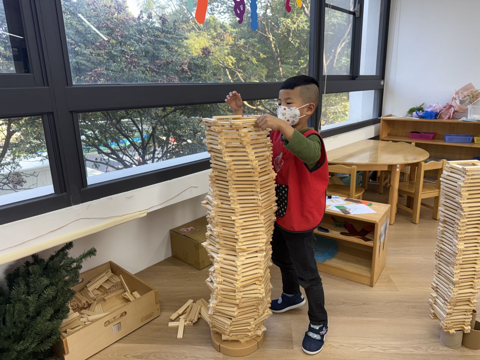 孩子們經過一個學期的探索,能力都有所提升,也會根據自己的生活經驗來製作積木作品,主題的延伸孩子進入到kapla區製作桃林鐵路或是運用單位積木製作火車等,這次最特別的是孩子開始發展出「高塔」的能力。