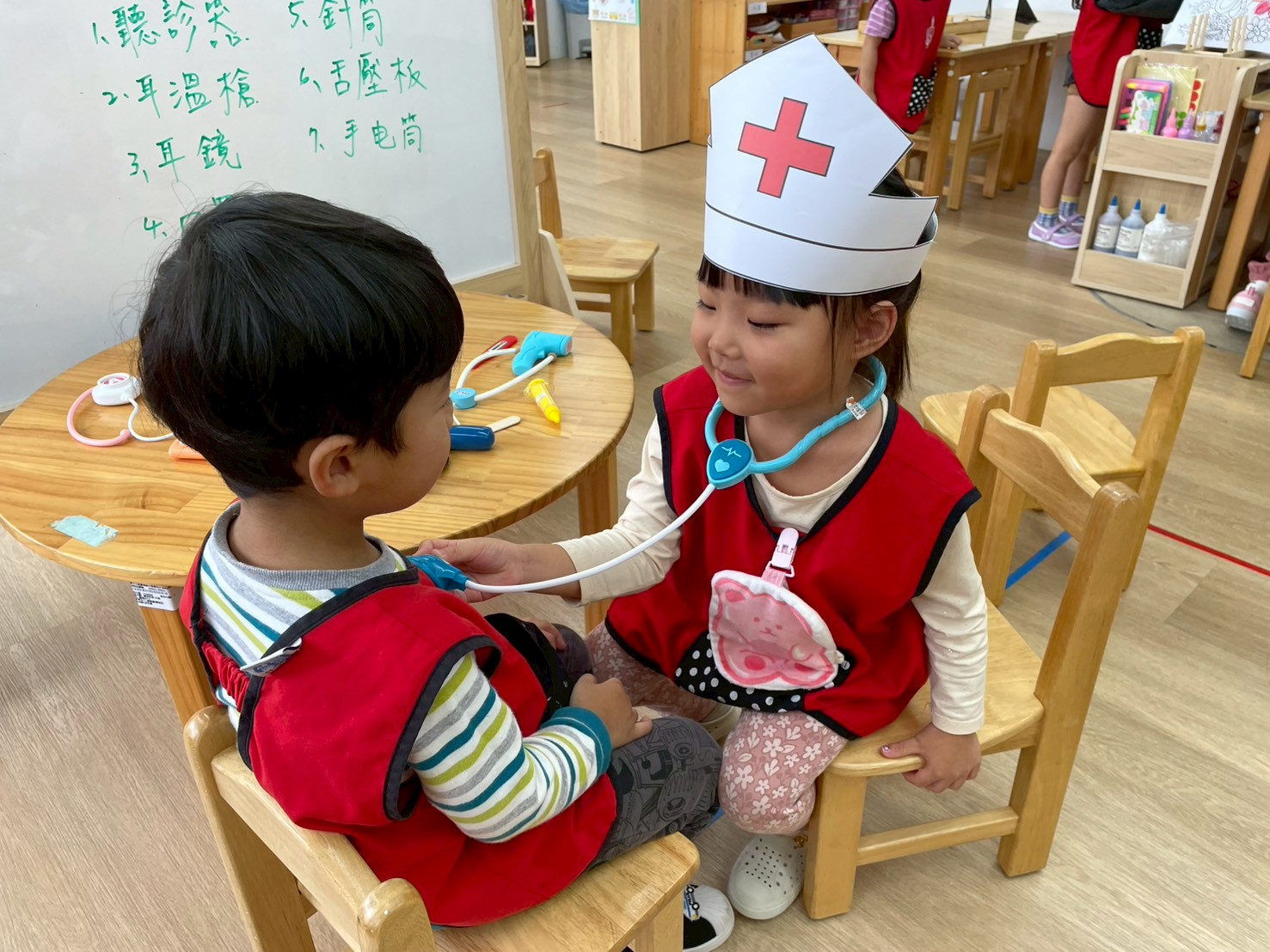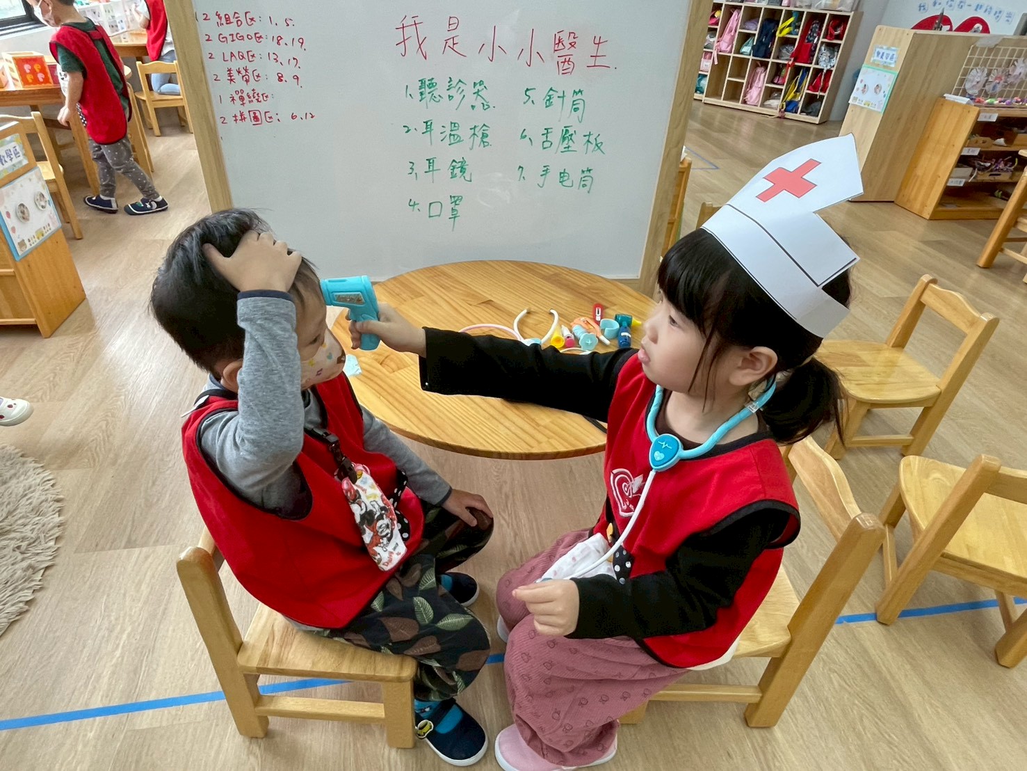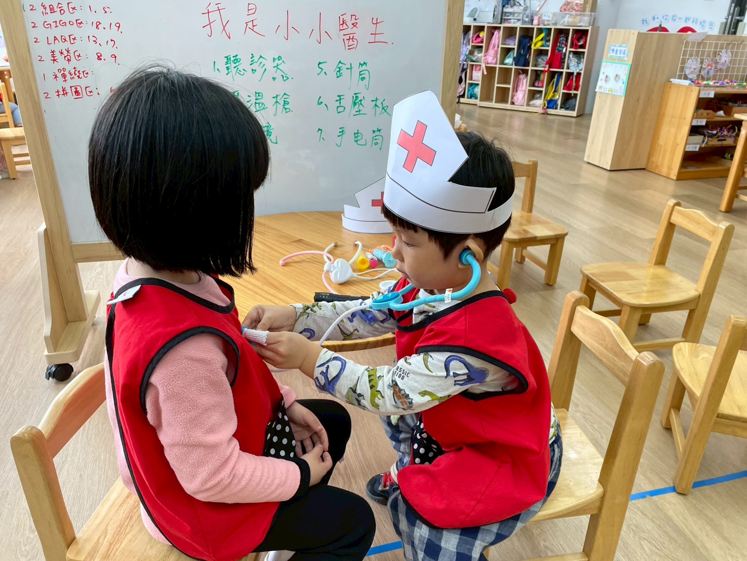 孩子們變身小小醫生,學習聽診、量體溫,體驗醫生照顧病人的工作。