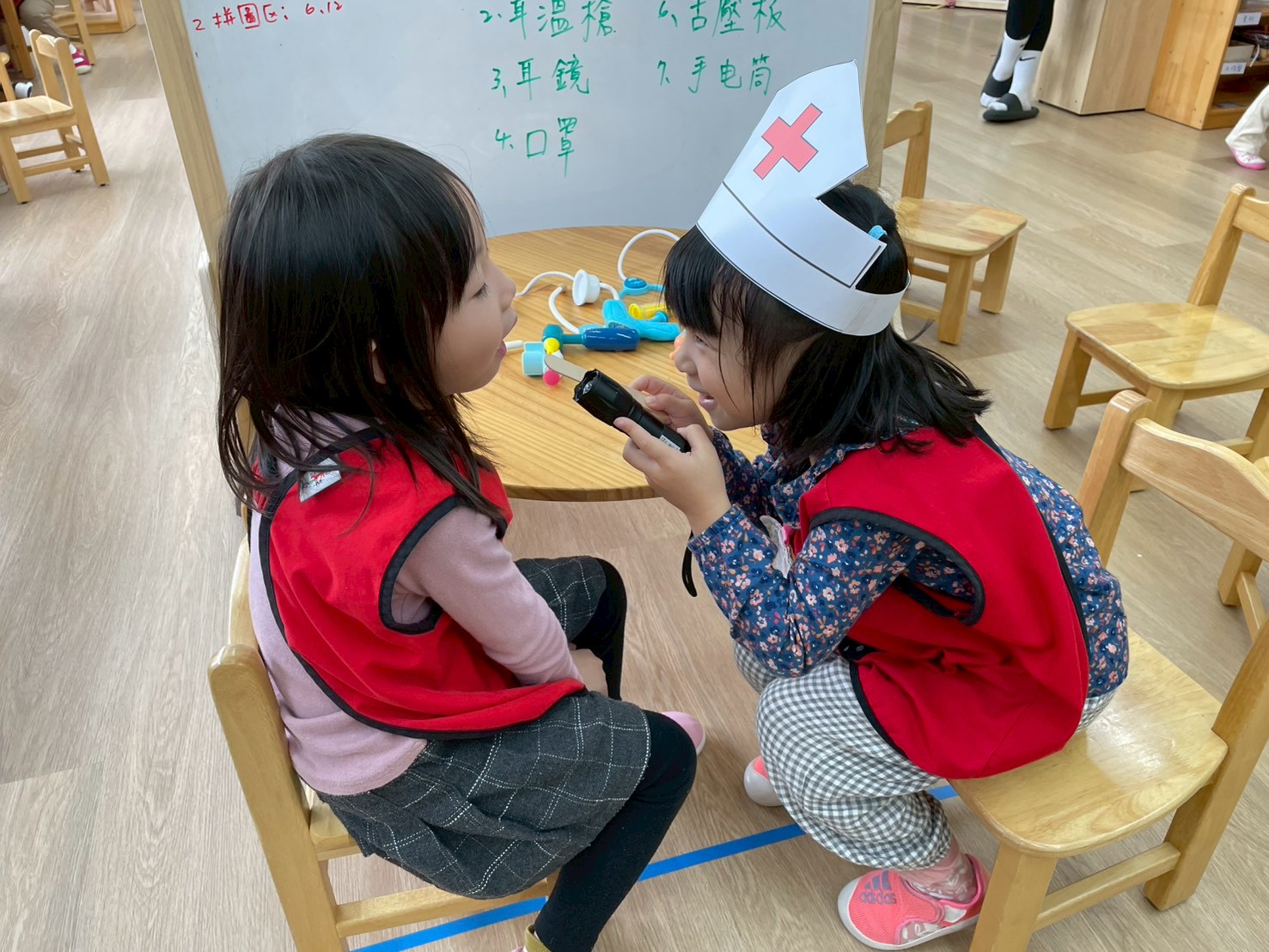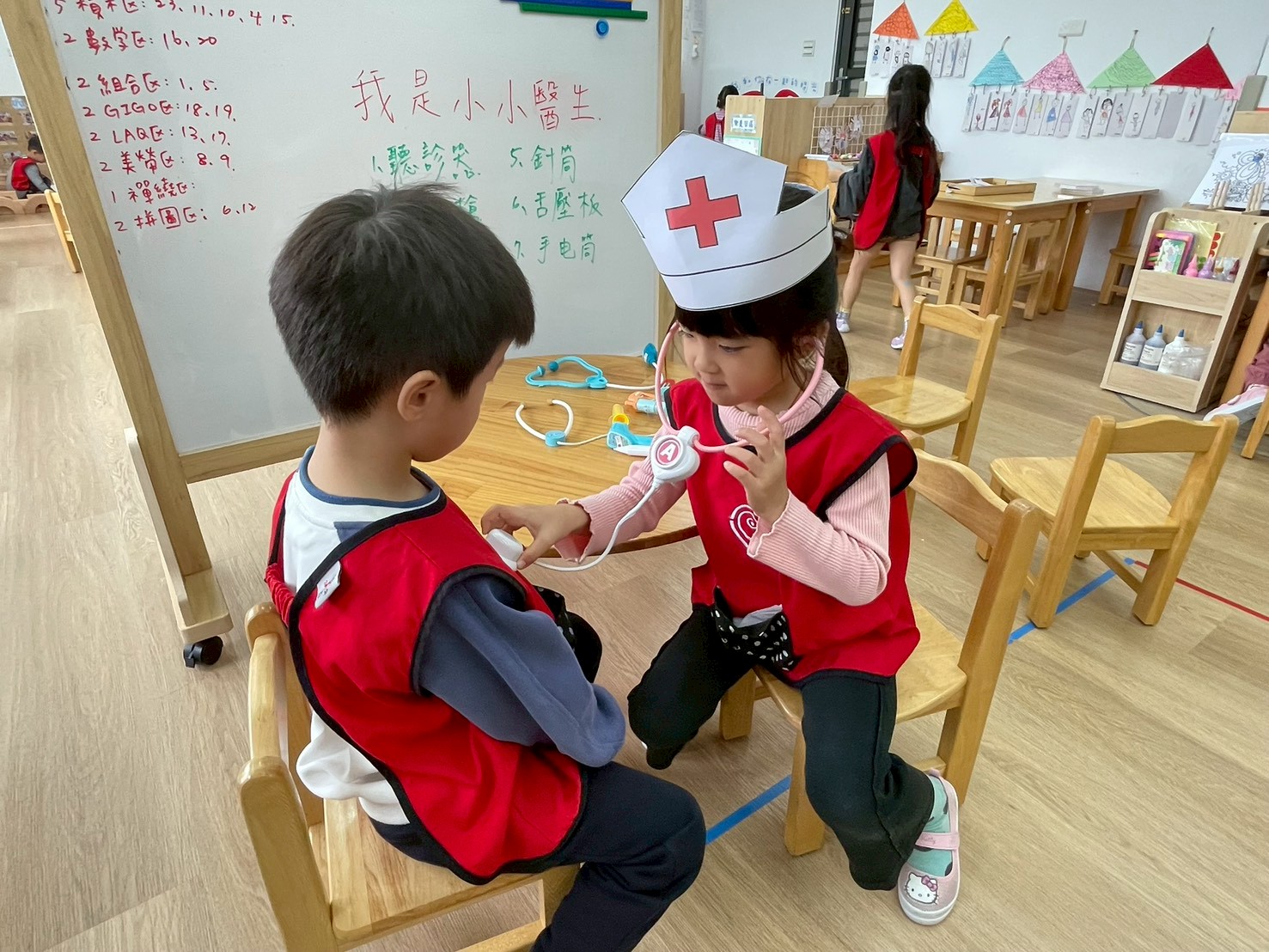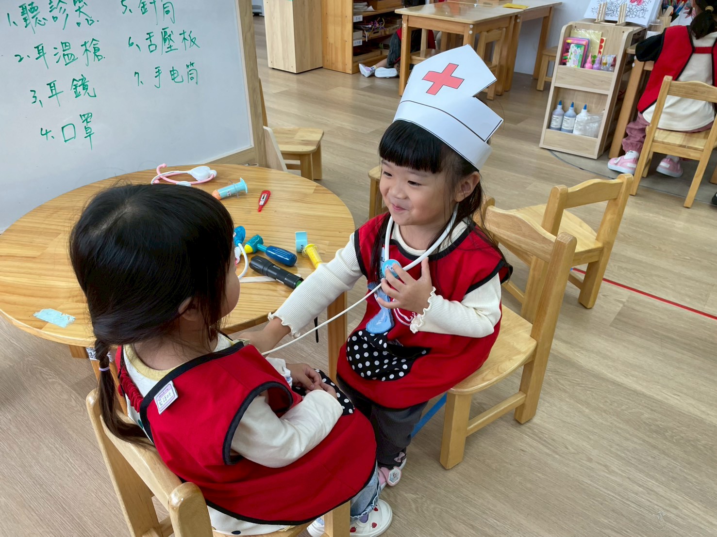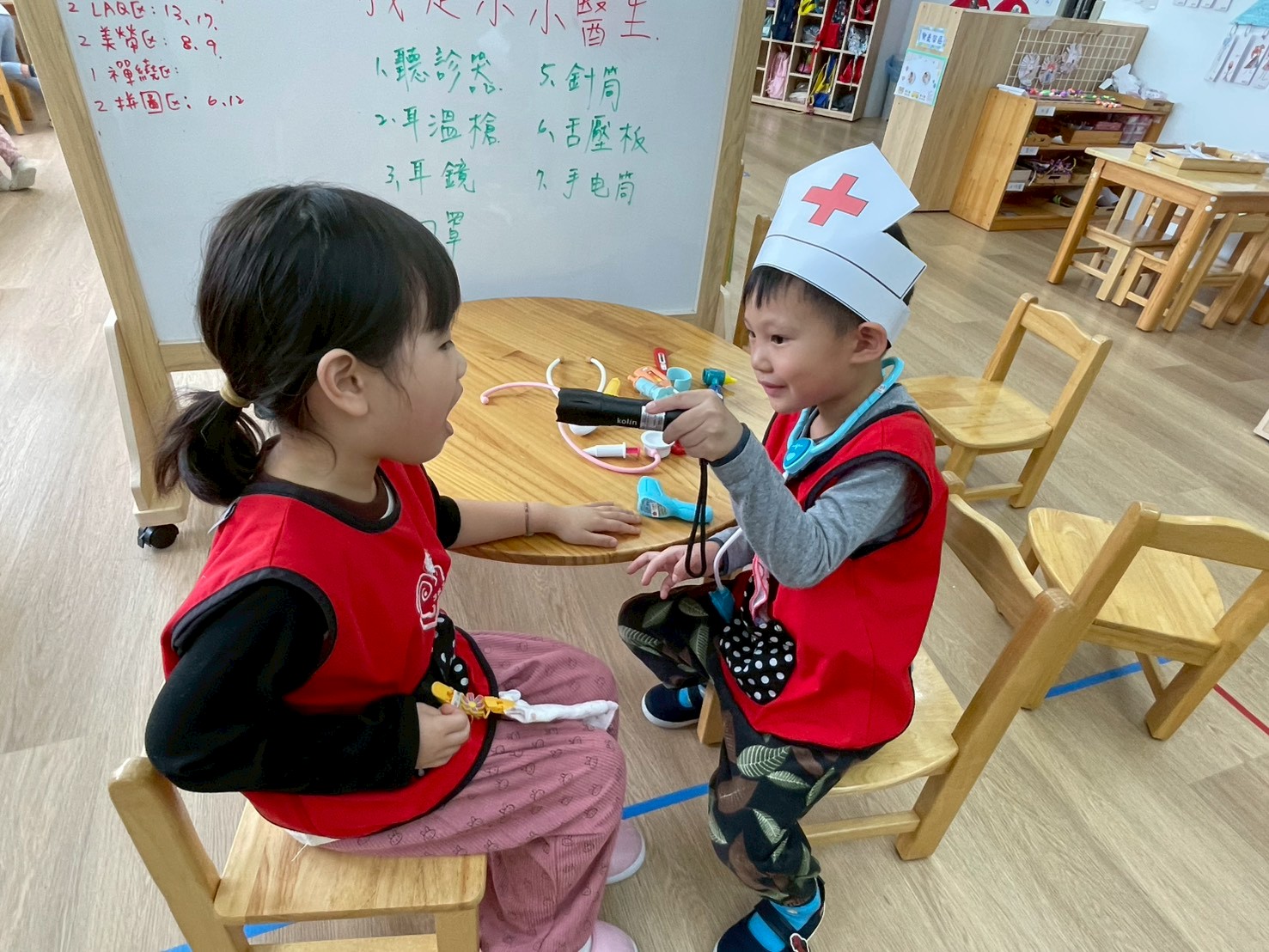 孩子們變身小小醫生,學習聽診、量體溫,體驗醫生照顧病人的工作。