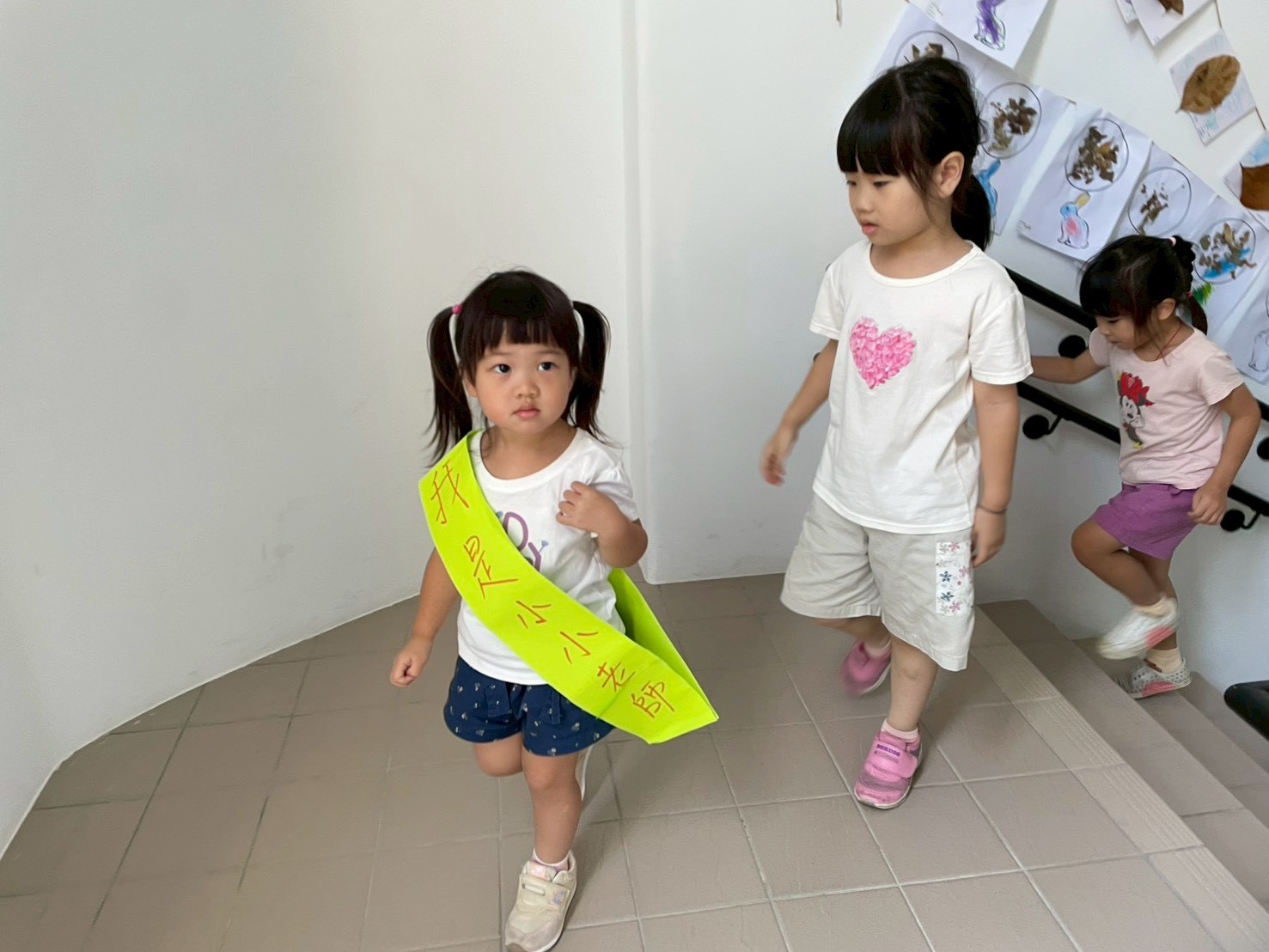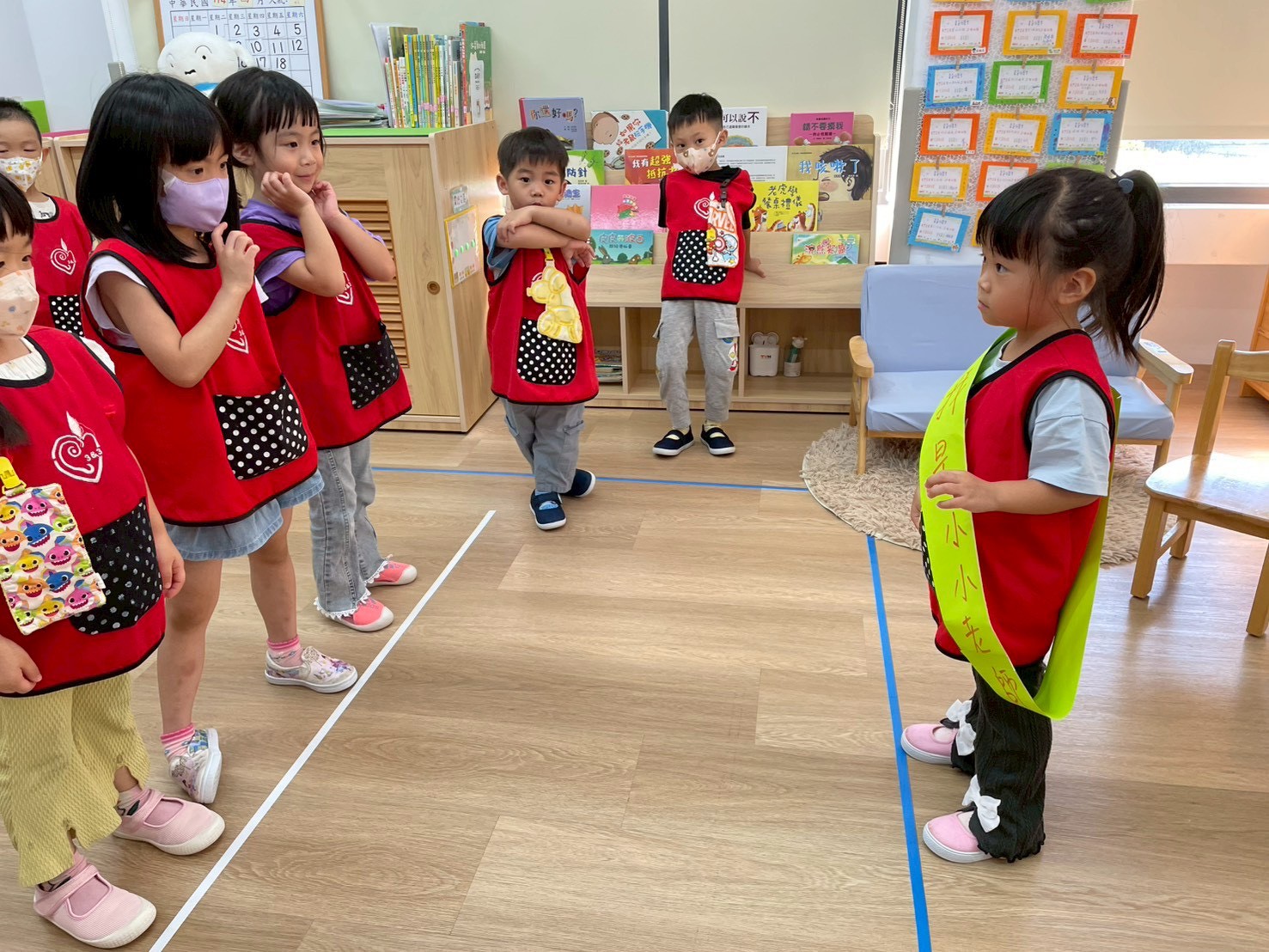 先透過點點名活動,讓孩子在聽到自己名字時能有反應;接著進行「找大頭」遊戲,引導孩子在教室裡找到自己的大頭照片,並藉此認識自己的座位或位置。