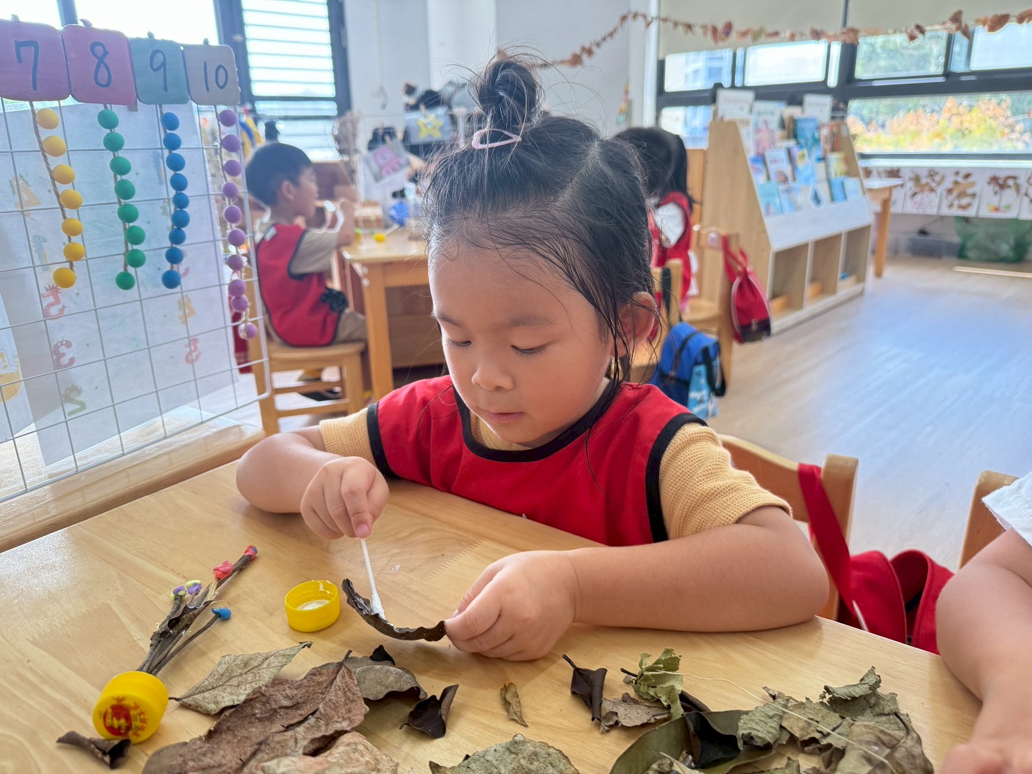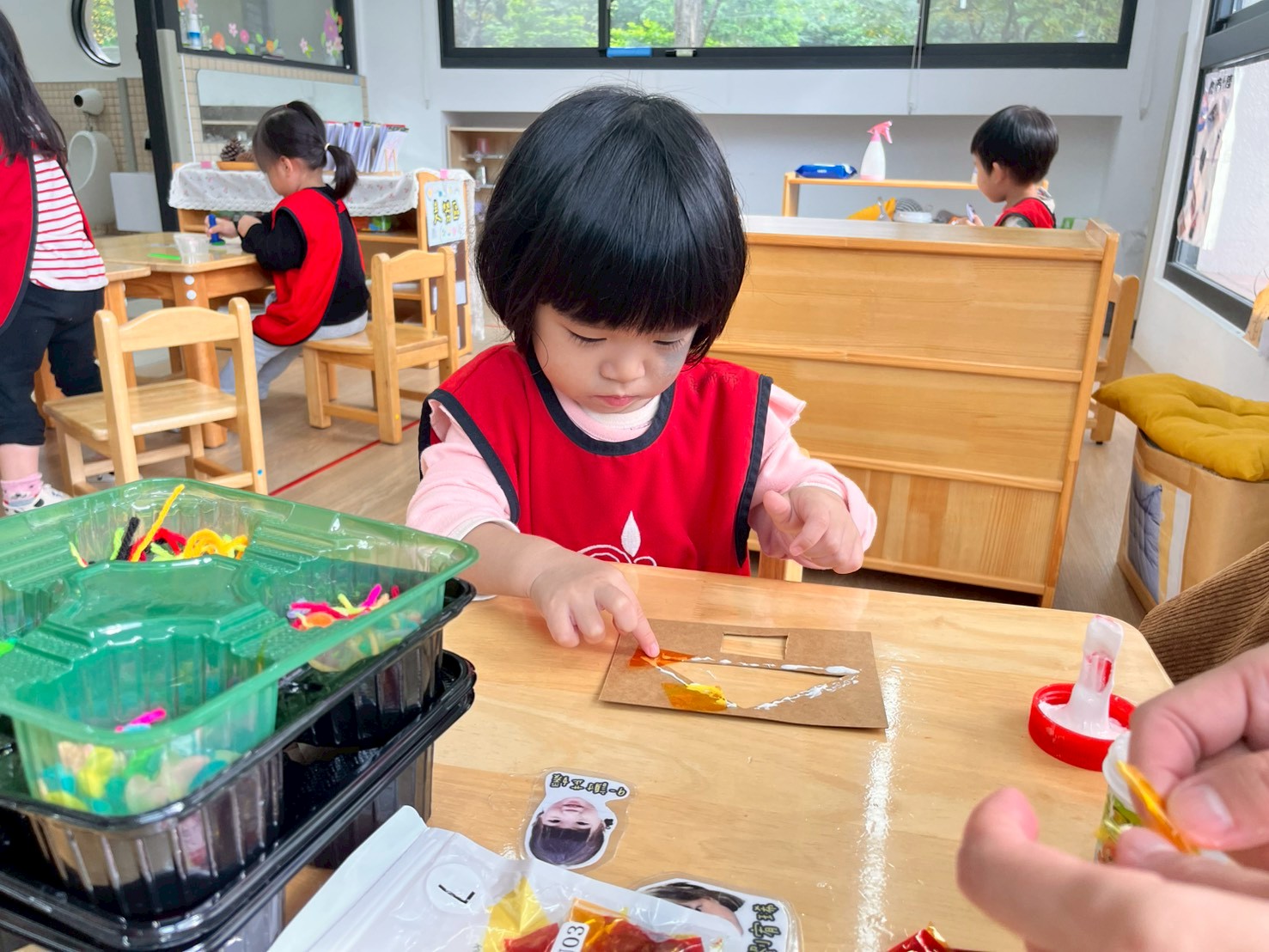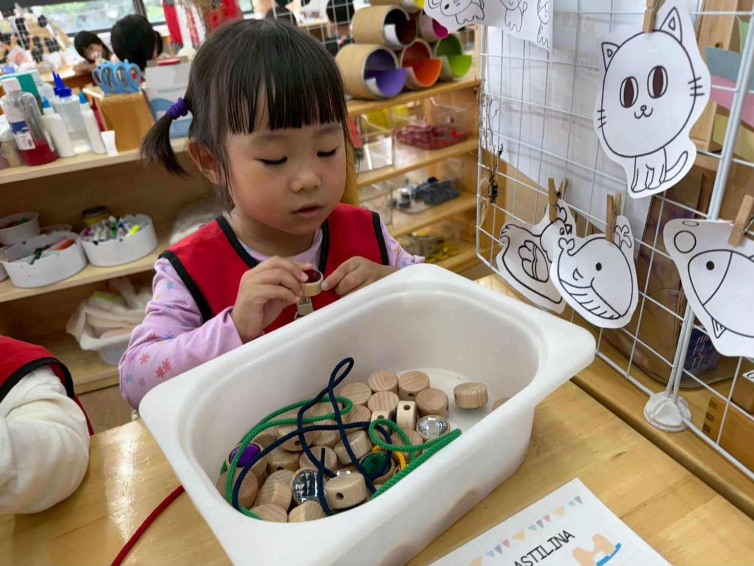 這個月在美勞區,有看到孩子們進行很多步一樣的嘗試,不管是玩鹽瓶、串珠、剪紙等等都操作的十分認真。