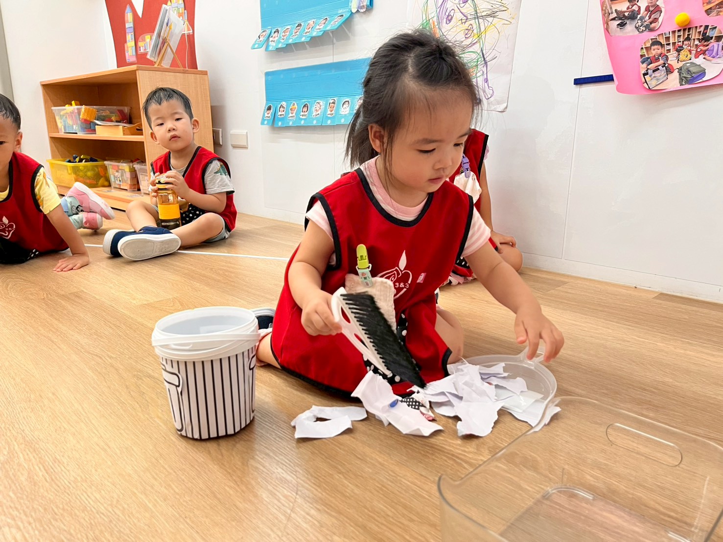 運用小掃把和畚箕的操作教具,練習手部小肌肉的扭轉和抓握能力,共同學習愛護教室的環境及養成健康衛生好習慣。