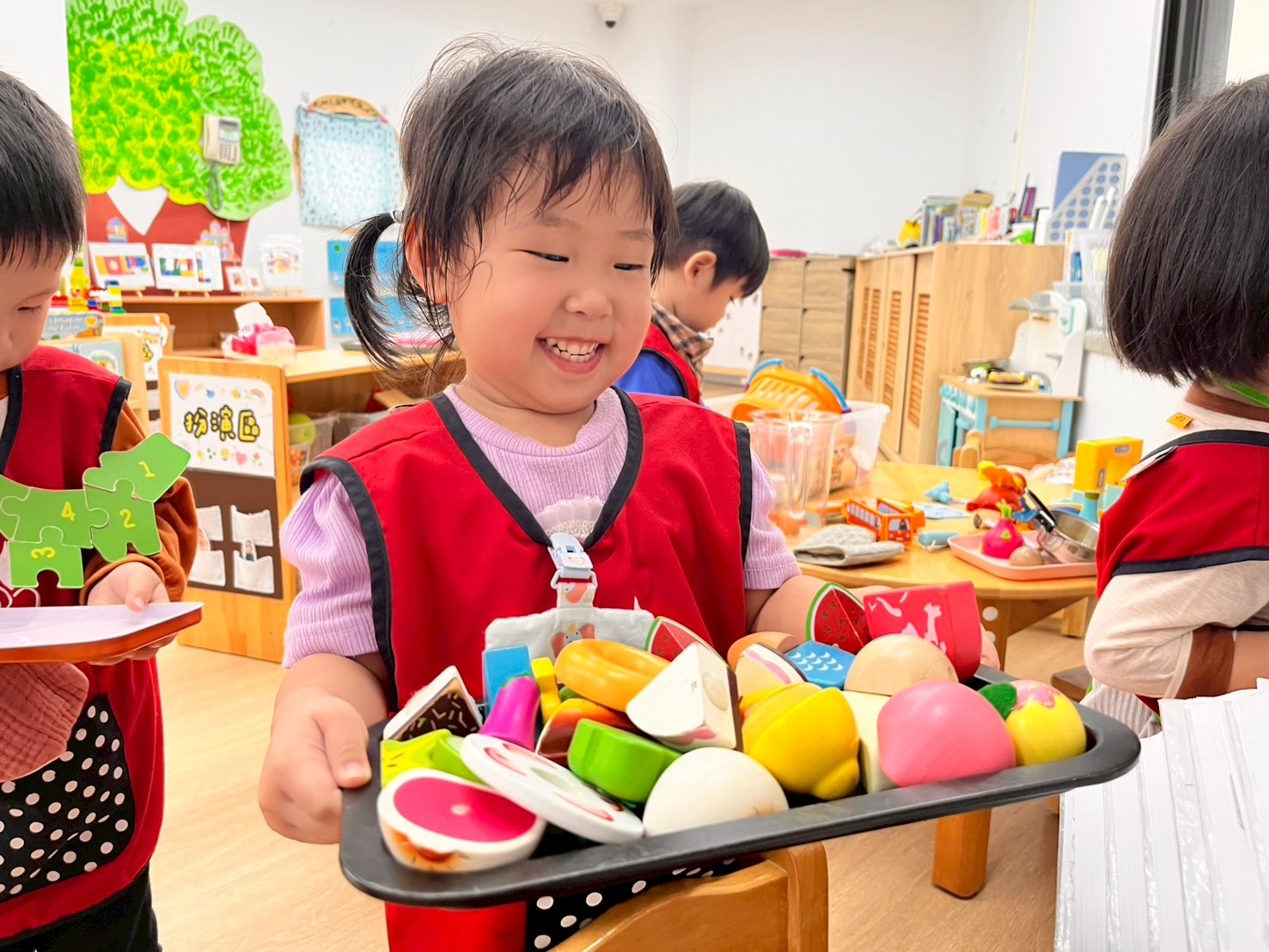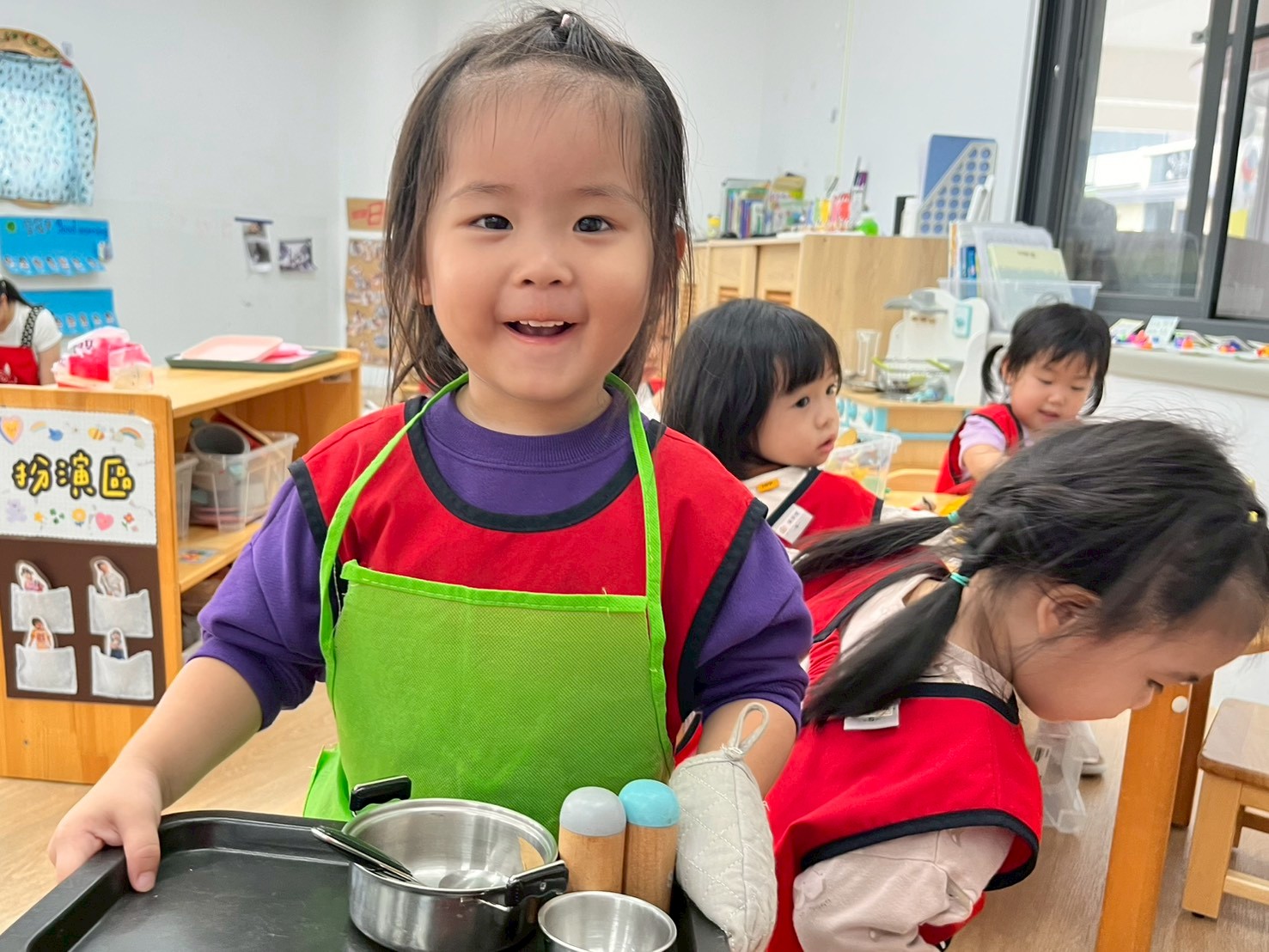 扮演區提供多樣角色扮演素材,讓孩子透過遊戲發展的想像力、與人際互動與生活經驗。