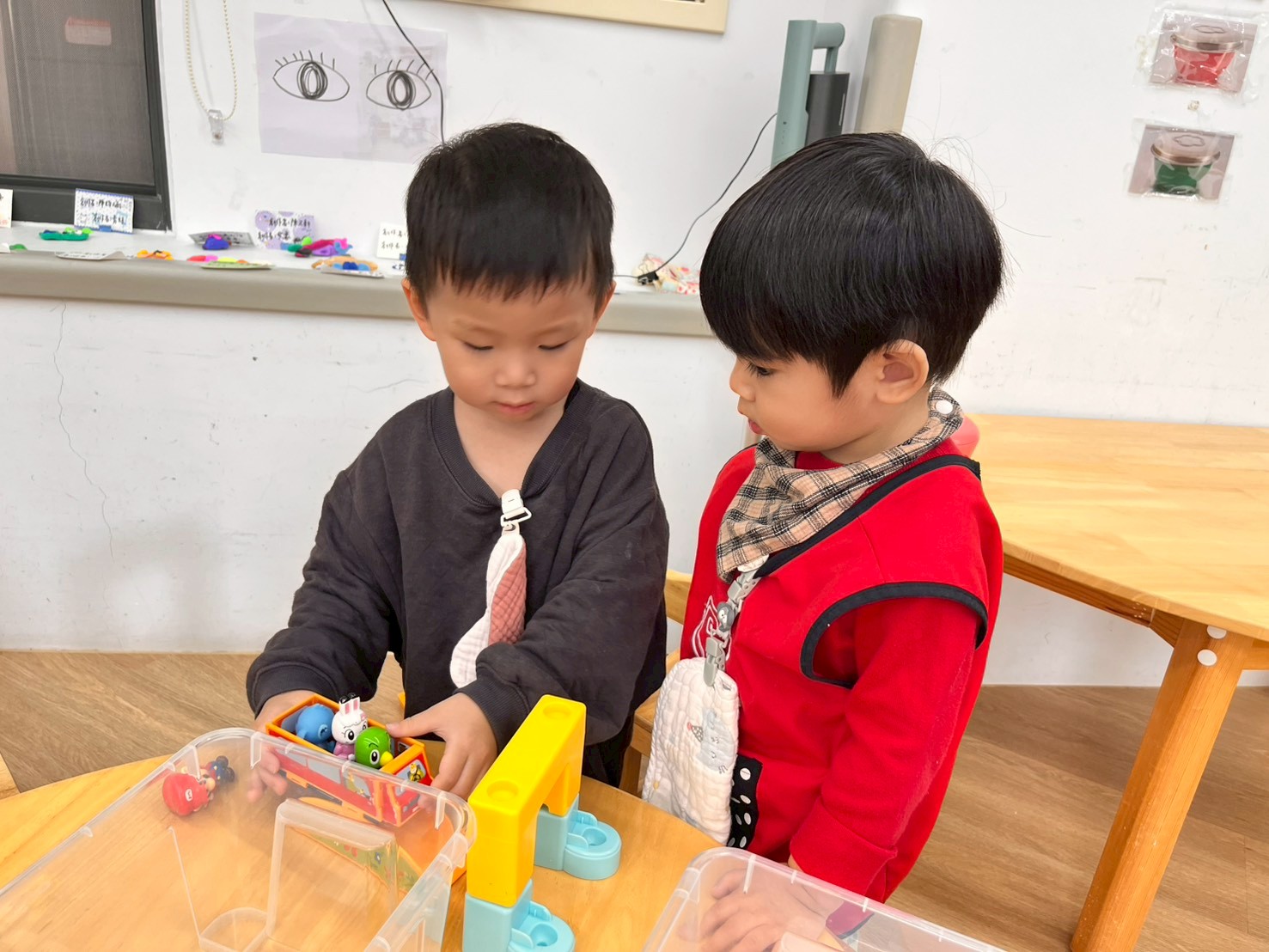 孩子在組合建構區動手搭建及拼組,發揮創意與想像,一起完成有趣作品。