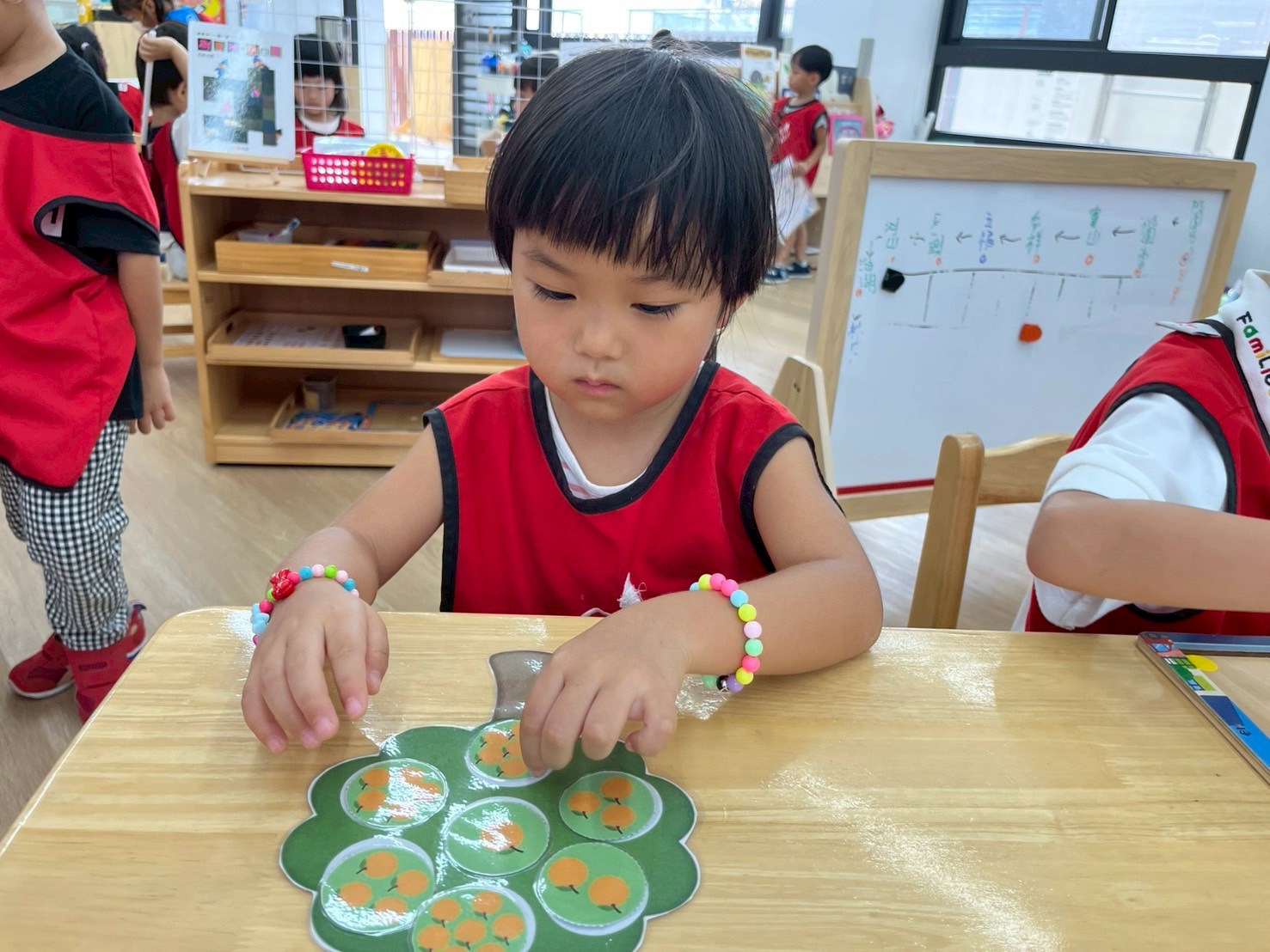 數學區不只是算數,孩子們透過不同的練習,去對應六型六色的位置、顏色,藉由對應的方式,也能提升孩子不同的創造力喔 !