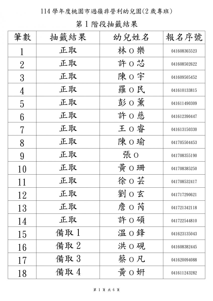 - 114學年 非營利幼兒園招生 第一階段抽籤結果 -