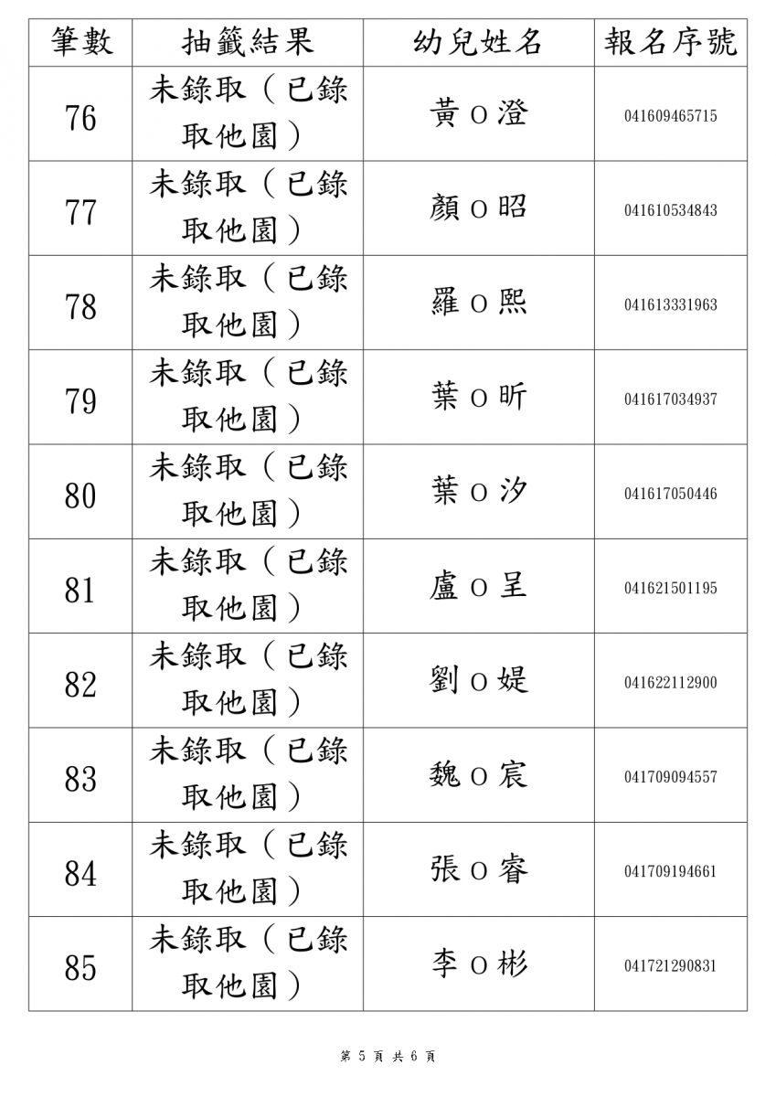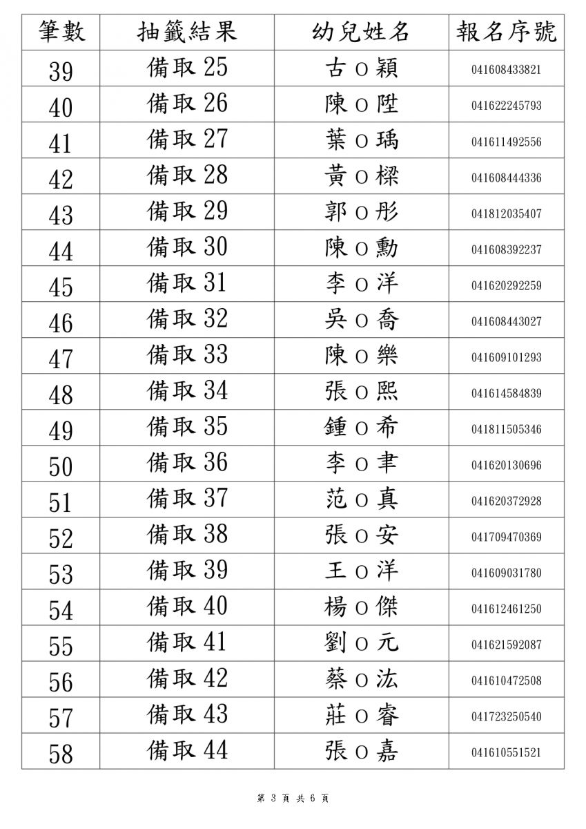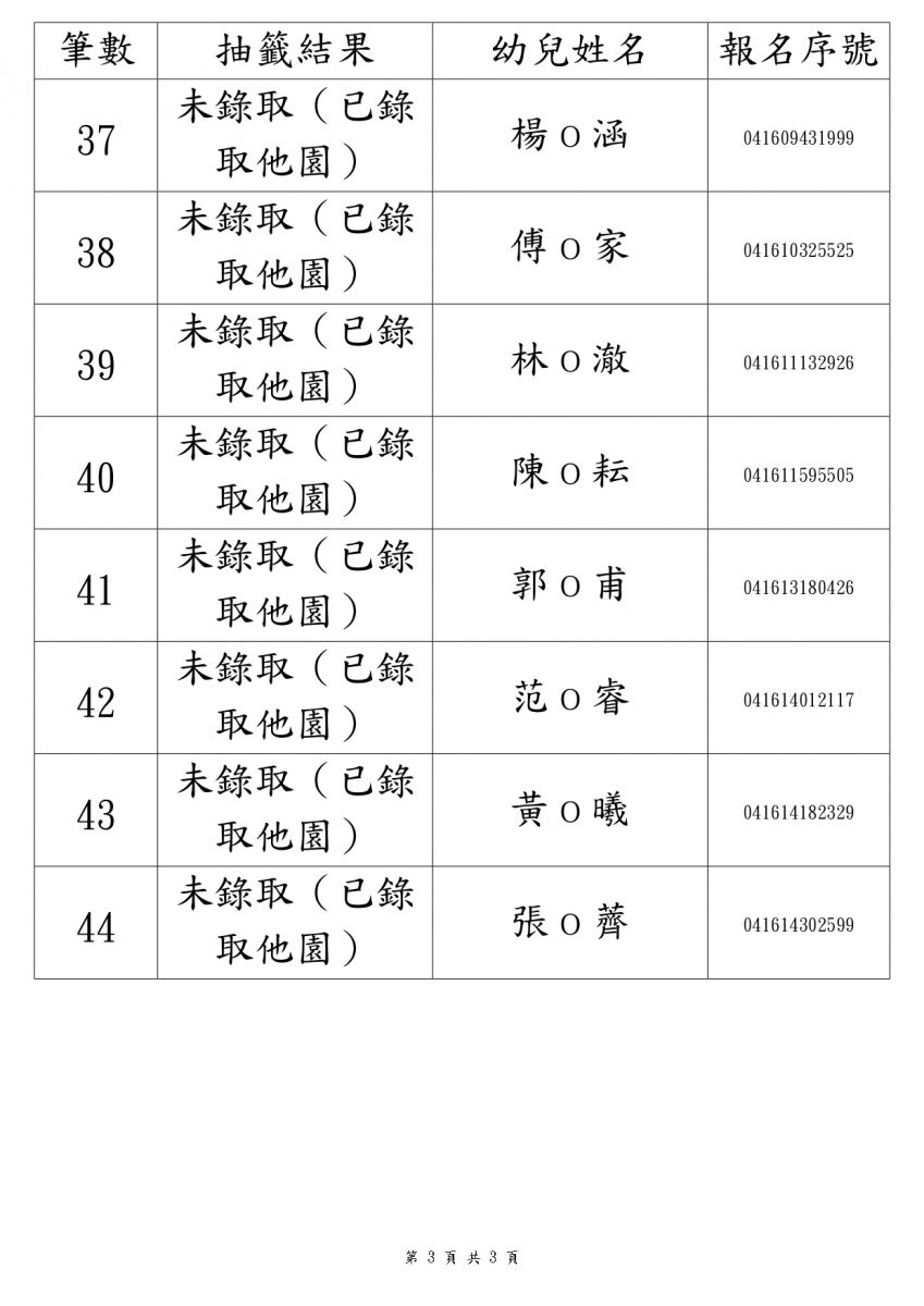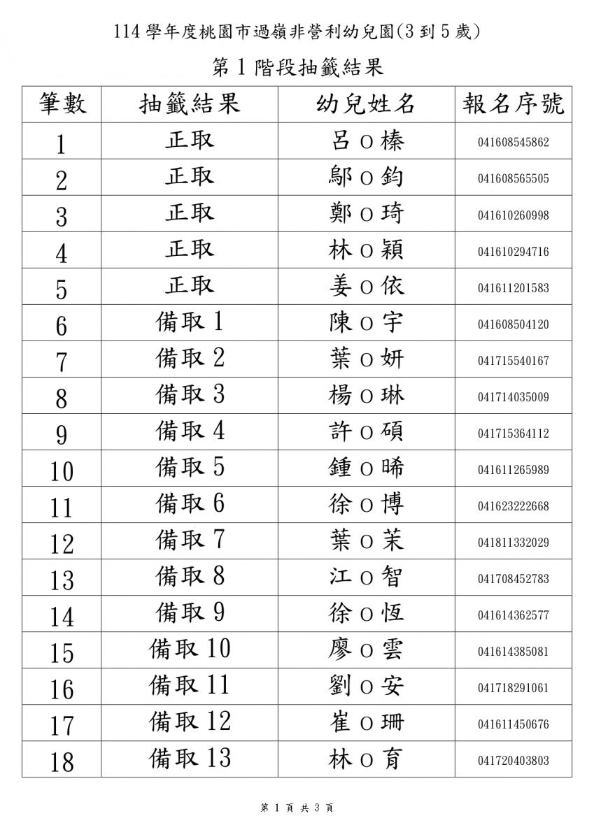 第一階段 3 到 5 歲 抽籤結果