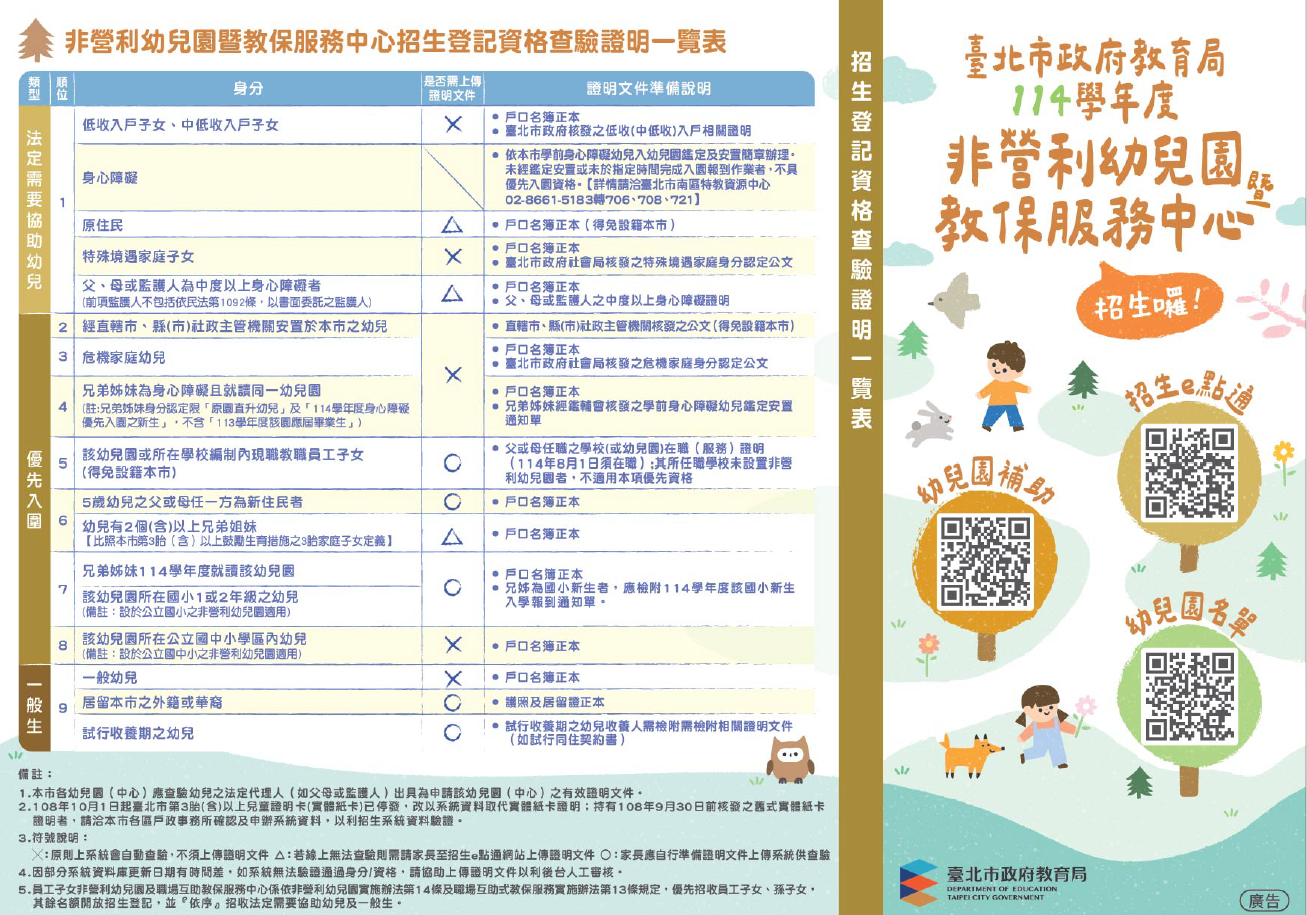 招生問答集連結:臺北市114學年度非營利幼兒園暨教保服務中心招生問答集Q&A