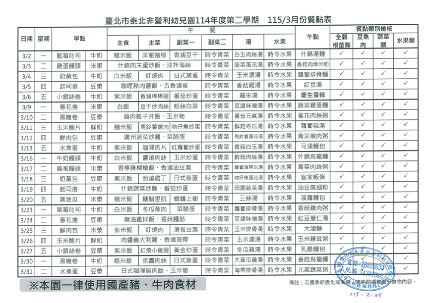 115年3月餐點表