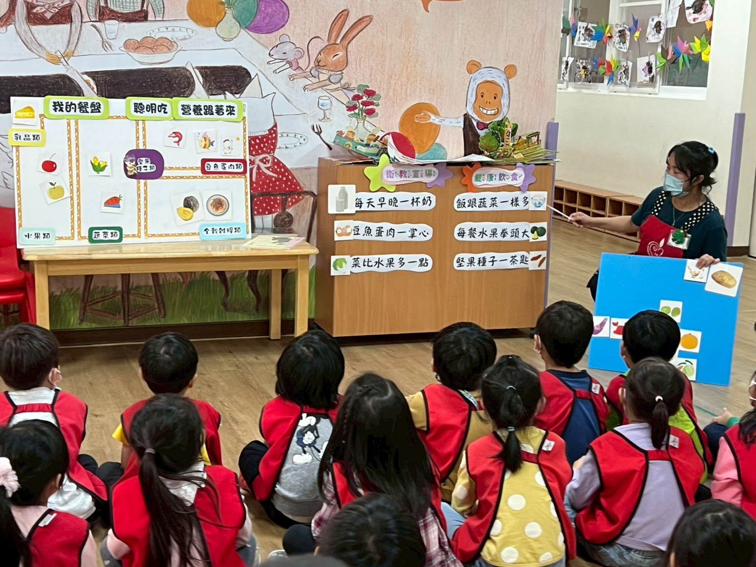 從健康飲食繪本及我的餐盤介介紹,健立幼兒健康飲食觀念,養成良好的飲食習慣。