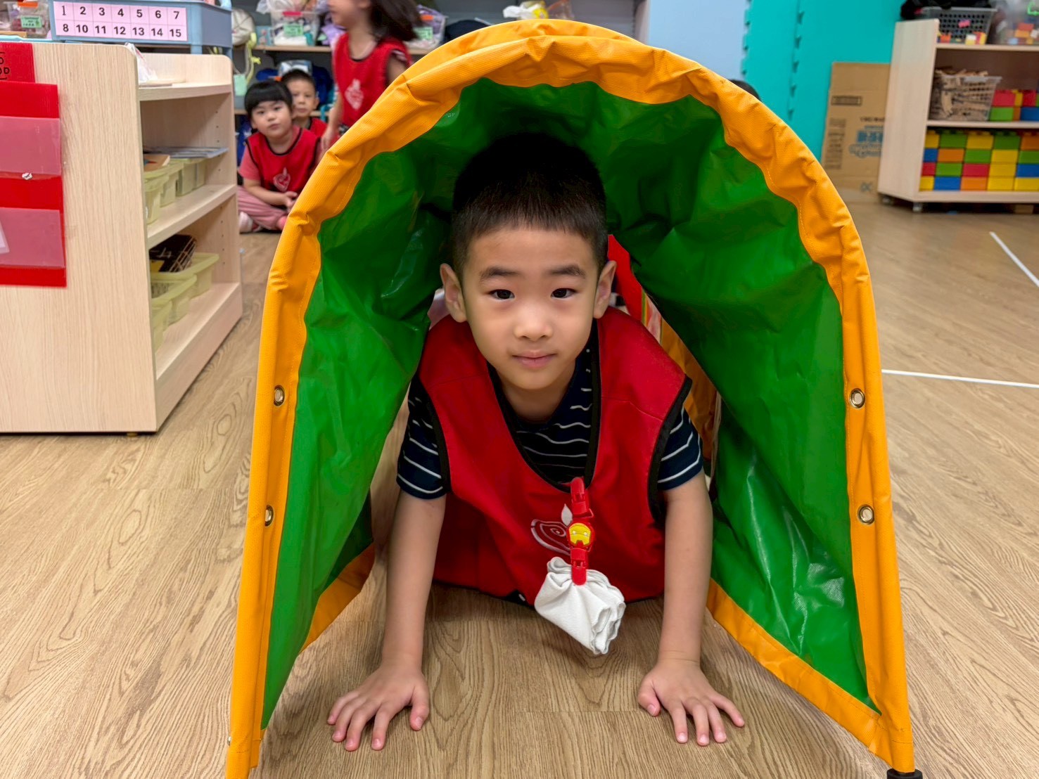 孩子們鑽進滑溜布中扮演小乳豬,在地面上快速蠕動、翻滾前進,歡笑聲此起彼落。這場「烤乳豬大賽」不只是好玩,更讓孩子在爬行與滾動中提升敏捷度,同時覺察身體在穩定與移動間的協調能力,強化動作控制與反應速度。