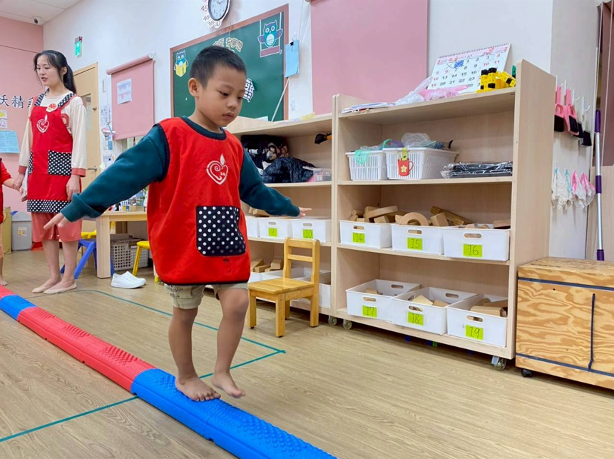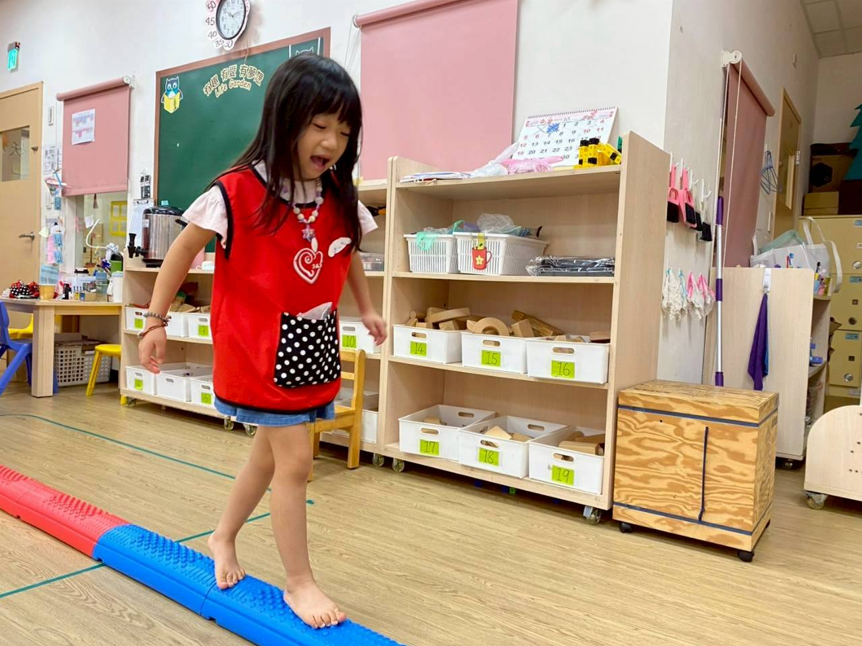 孩子們透過連續跳躍呼拉圈障礙物,與行走萬象組的挑戰,練習下肢肌耐力與身體協調性,活動同時模擬各種動態平衡動作,提升幼兒的專注力與身體控制能力,讓孩子在遊戲中強化動作發展。