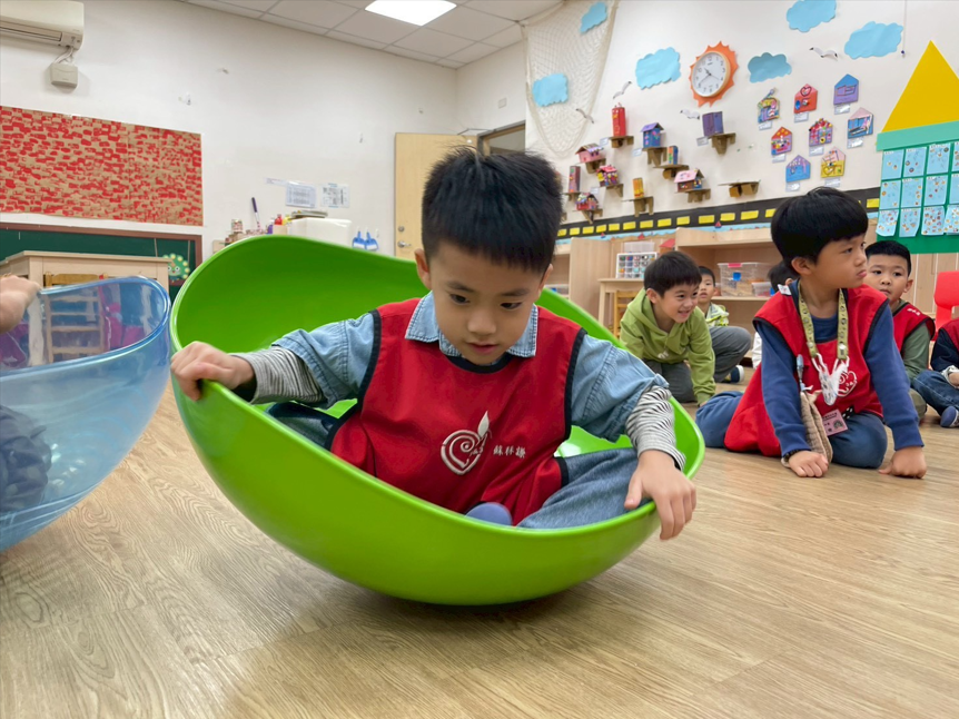孩子在老師的陪伴下鑽進滾輪,滾動前進不只是有趣,更能訓練前庭覺、平衡感與大肌肉協調,透過遊戲培養孩子勇氣、與空間感。
