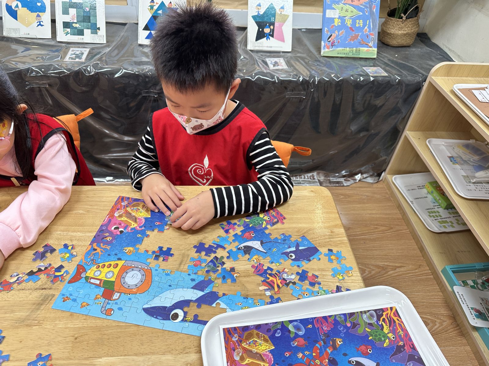 活動觀察:孩子們在數學區透過桌遊與拼圖遊戲,練習專注力、規則意識與邏輯思考。