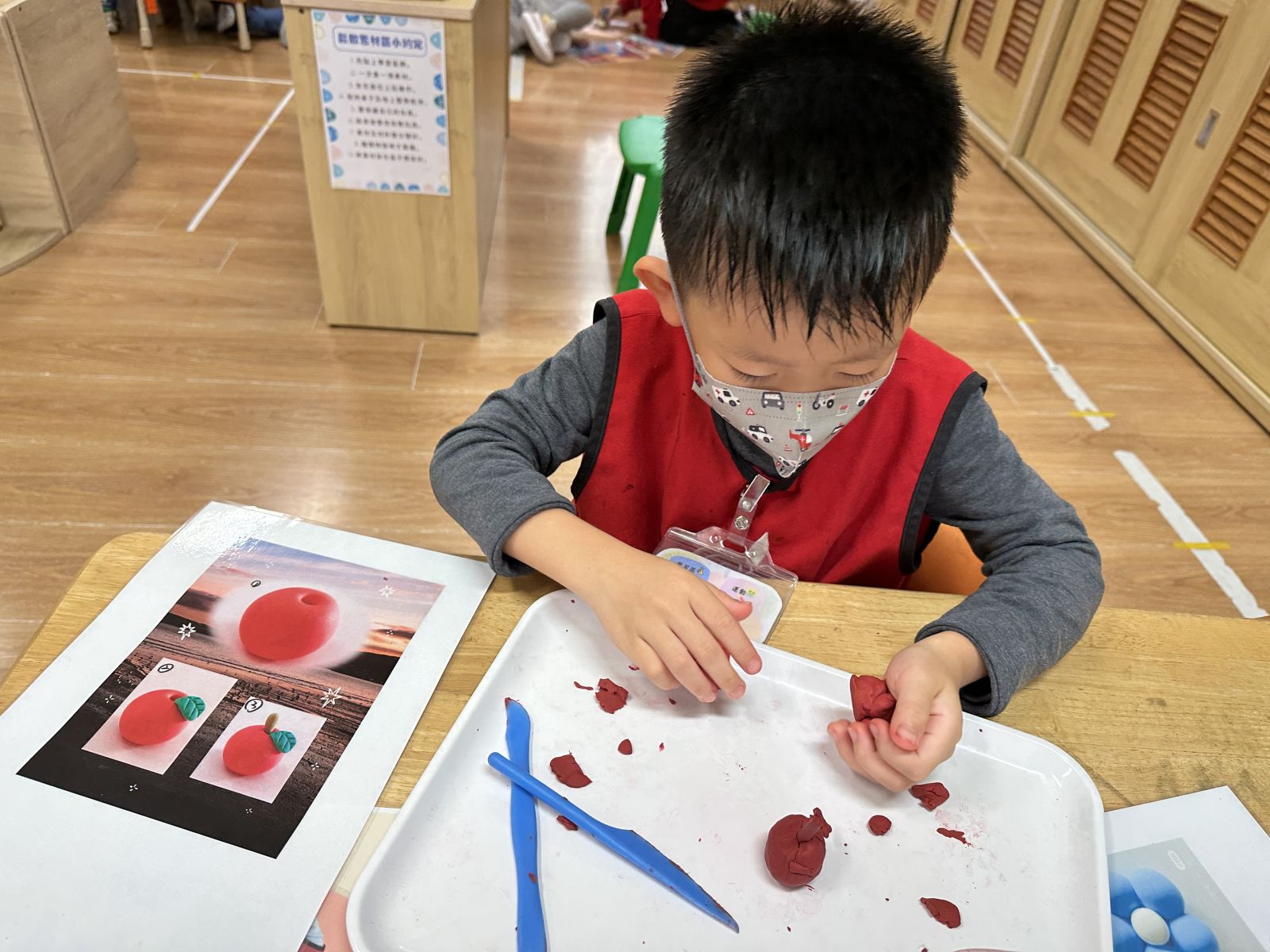 運用美勞區繪畫範例圖練習及搓揉黏土資源,創作出有趣的作品增進小肌肉發展。