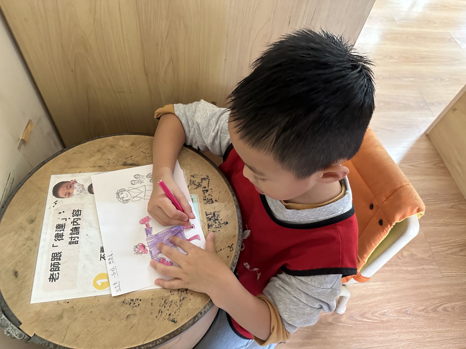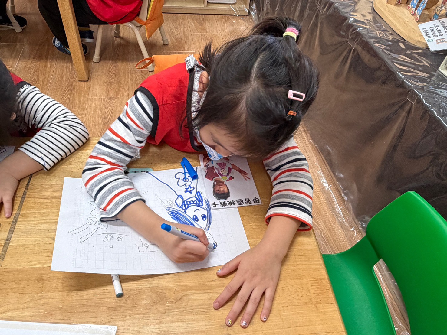 孩子們觀看小人物圖示後,依步驟塗畫頭、身體與四肢,並主動加入五官與服裝細節。過程中展現觀察力、手部操作能力,並發揮創意表現自我。