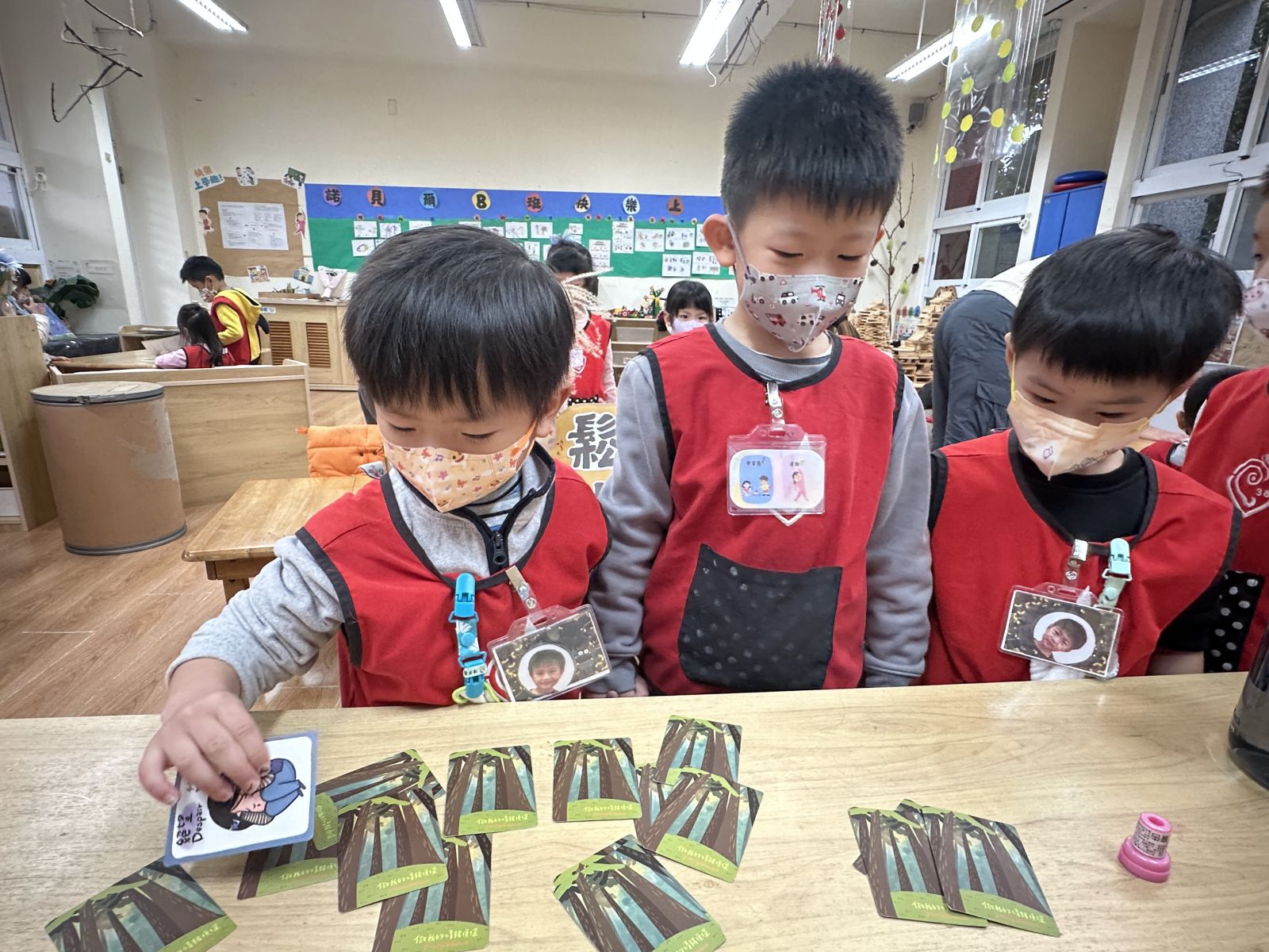 孩子在闖關活動中帶著弟弟妹妹一起思考「情緒是什麼顏色」,並透過翻找情緒卡牌與情緒繪本來辨識與討論不同情緒。接著挑戰哥哥姊姊的學習區關卡,一同合作完成任務,過程中展現帶領能力、合作技巧與情緒理解能力。
