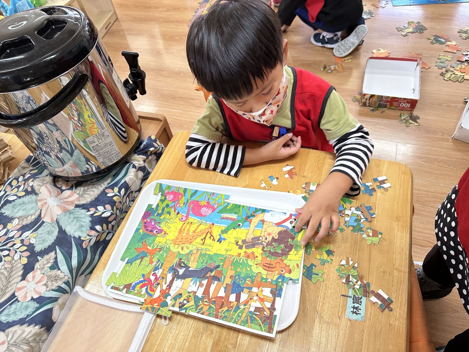 孩子們在數學區拼拼圖的過程中,能專心觀察形狀與位置,反覆嘗試配對,逐步培養空間概念、耐心與解決問題的能力。