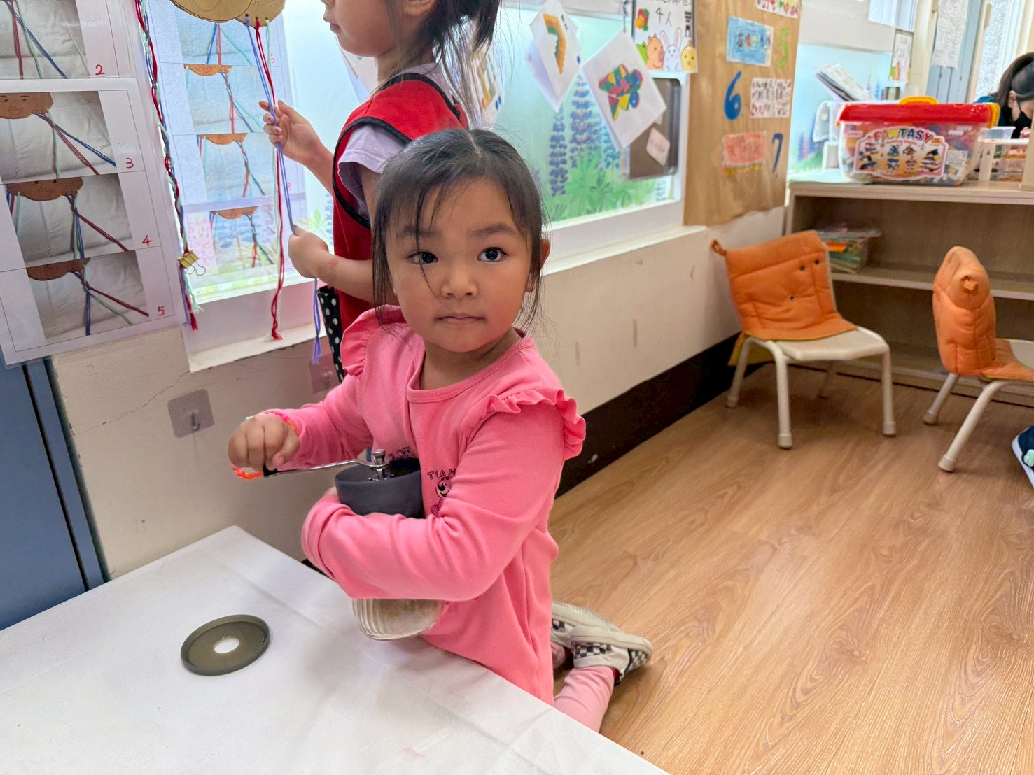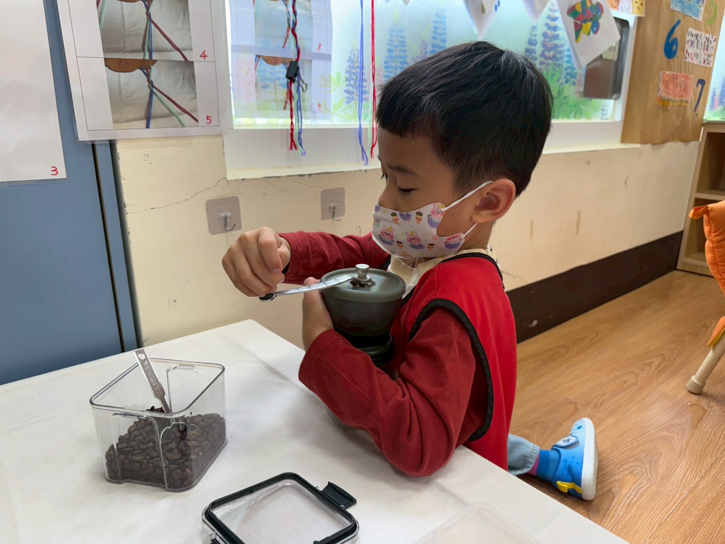 本週增加磨咖啡機的活動,透過全指運動須配合身體力量去旋轉開關,透過指引箭頭將咖啡豆磨成粉,孩子們看到自己的努力有所成果,自信滿滿唷!