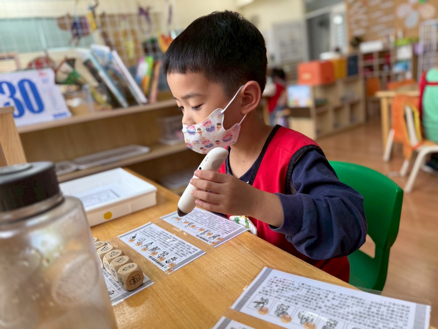 孩子們透過點讀筆聆聽《我的快樂歌謠》和班級歌,感受語詞韻律並熟悉歌曲。同時進行姓名配對遊戲,練習辨識名字,認識自己與同伴,提升文字敏感度。