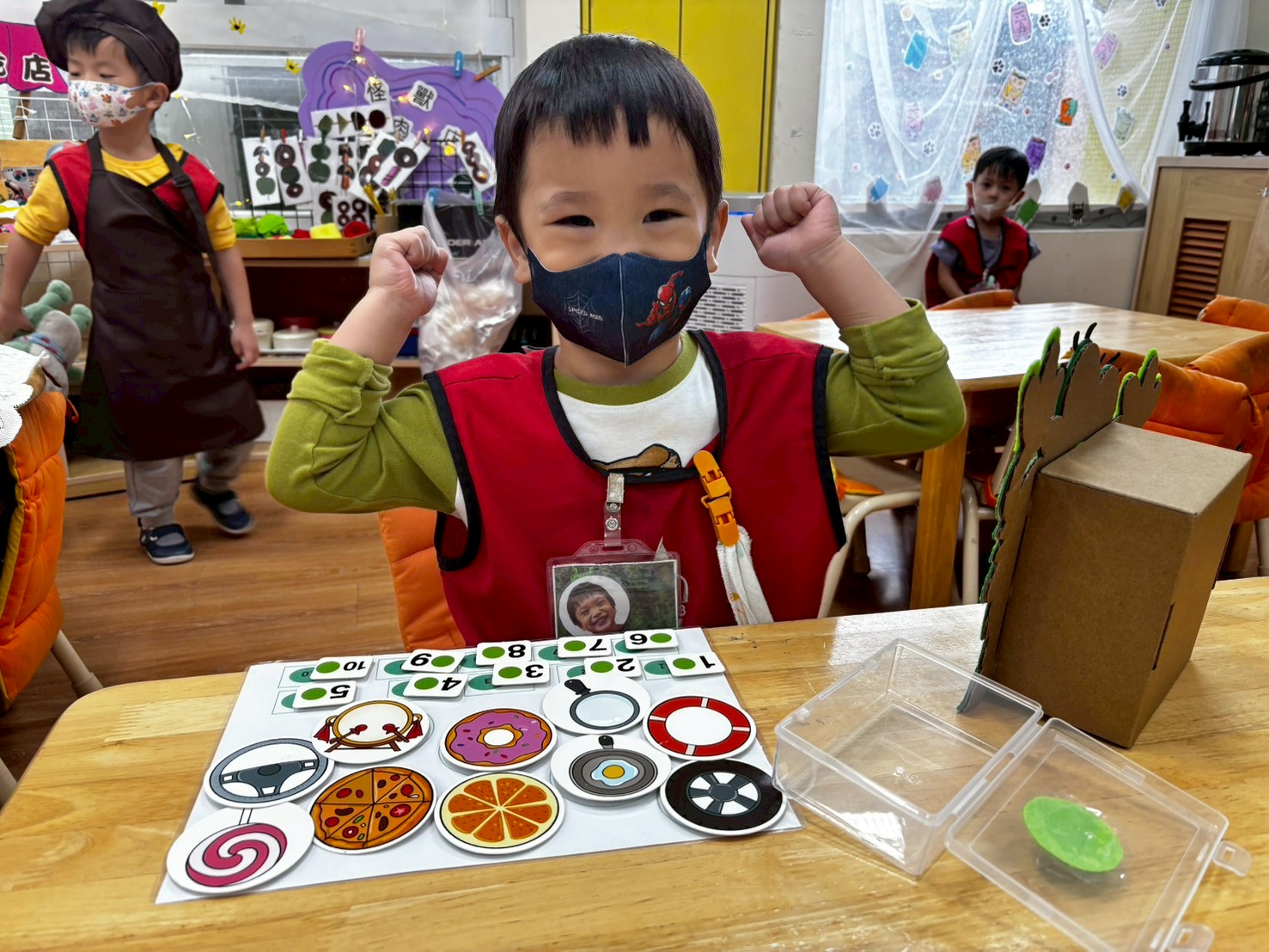 孩子透過把彩色怪獸的顏色做成烤肉串,在操作的過程中學習數數與認識數量,並能將不同顏色組合起來,設計成套餐,練習分類與配對。延伸到麵店遊戲時,孩子能透過點餐、出餐的互動,表達自己的需求,並體驗角色扮演的樂趣。也延續麵店的遊戲,孩子們可以自由搭配套餐,練習表達需求與角色互動,在遊戲中自然體驗數量概念與生活語言。