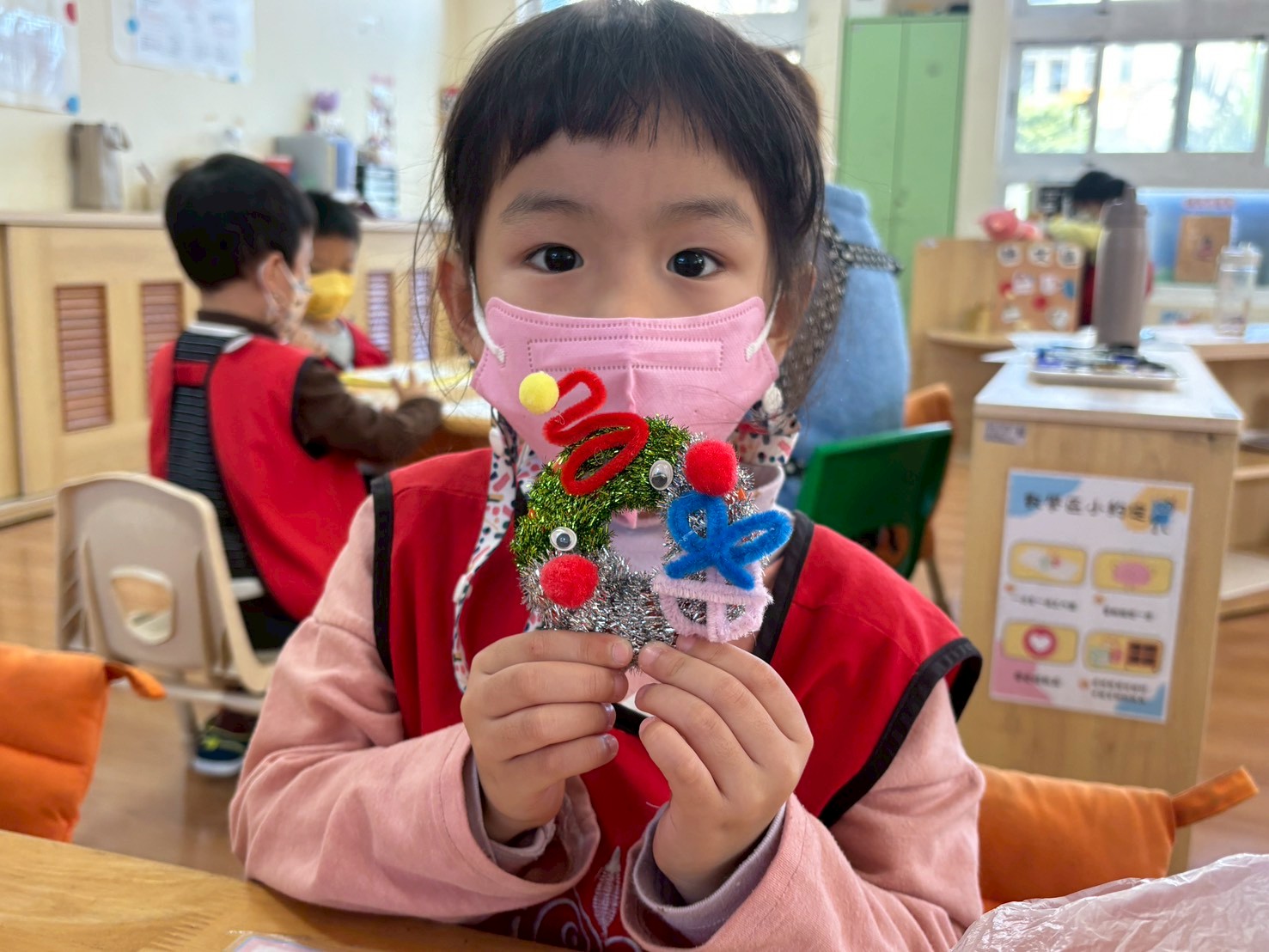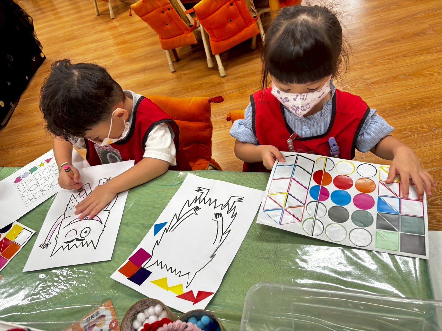孩子們開始為怪獸加上自己的創意——有人加上彩色角角,有人用貼紙做出亮亮的眼睛,有人把怪獸畫成跟自己一樣的髮型。每個孩子都用很認真的方式,把心情變成一個「可以戴在身上的圖案」。老師會把作品黏貼在圓形的小底板上,加上別針或貼紙背膠,一枚專屬於孩子的「情緒怪獸徽章」就完成了。