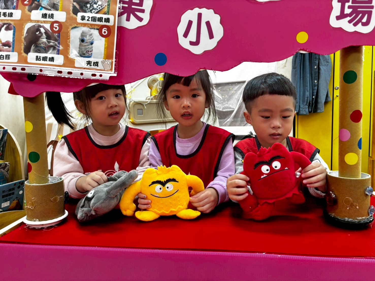 語文區裡,孩子們透過彩色怪獸的繪本和圖片,能慢慢認識角色與不同的情緒表情,學習用簡單的詞語來表達心情。他們會運用手偶和小劇場進行角色扮演,在模仿怪獸說話的過程中,嘗試用簡單的句子表達角色的語氣與感受。孩子們也能專心聆聽老師和同伴的對話,並試著回應,從中練習傾聽與表達。同時,他們會在故事延伸的活動中分享自己的感受,把語文學習和情緒覺察自然結合在一起。