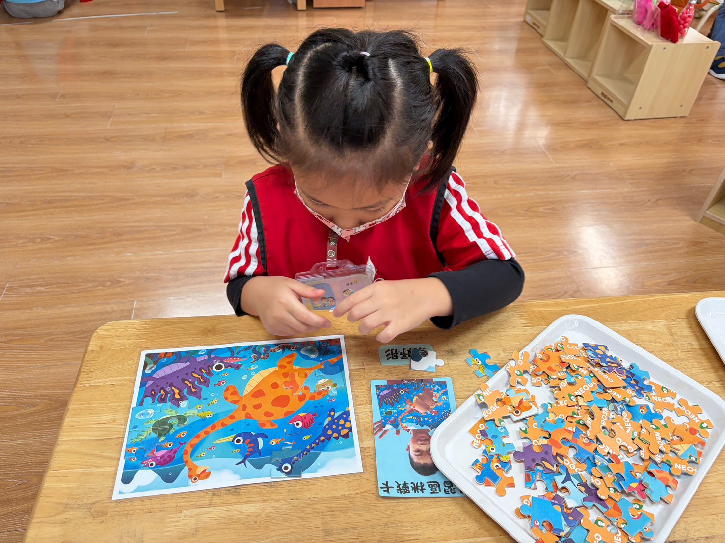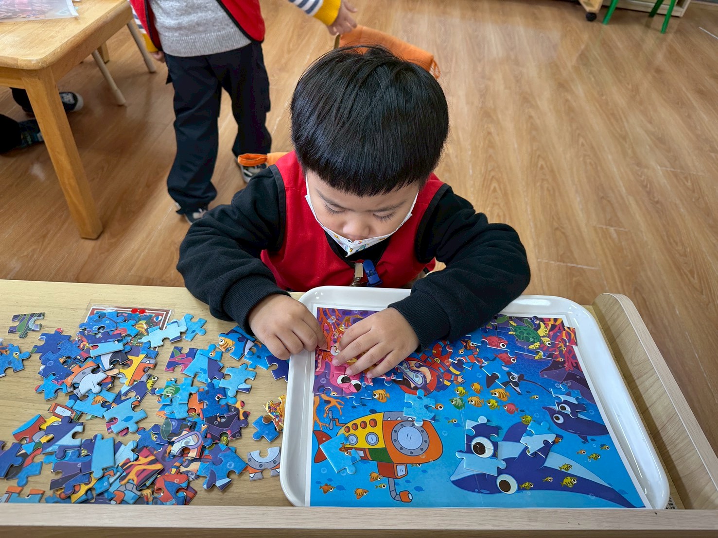 孩子在數學區進行拼圖活動時,先從從星星數較少的拼圖開始挑戰,逐漸過渡到星星數越高的拼圖,過程中透過觀察形狀、顏色與位置進行思考與調整,展現耐心、專注力與邏輯思考能力。