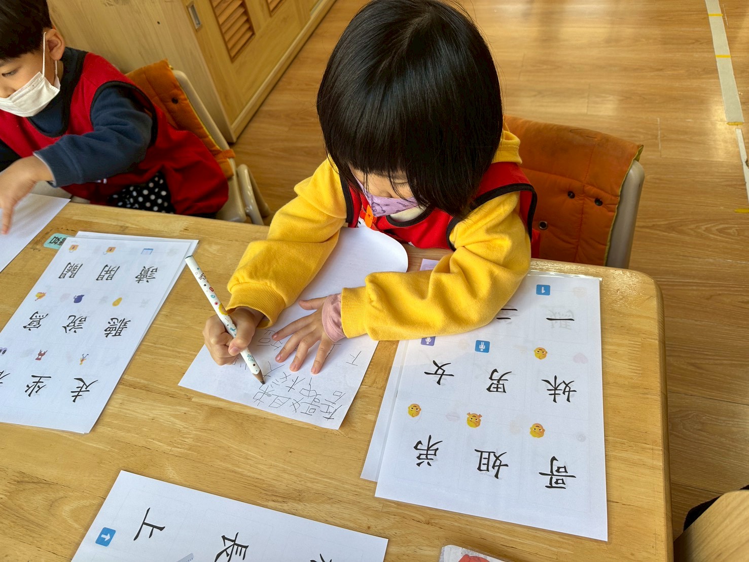 孩子們在語文區練習書寫中文字時,能專心觀察字形結構並反覆嘗試筆畫順序,逐步提升書寫的穩定度、自信心與專注力。