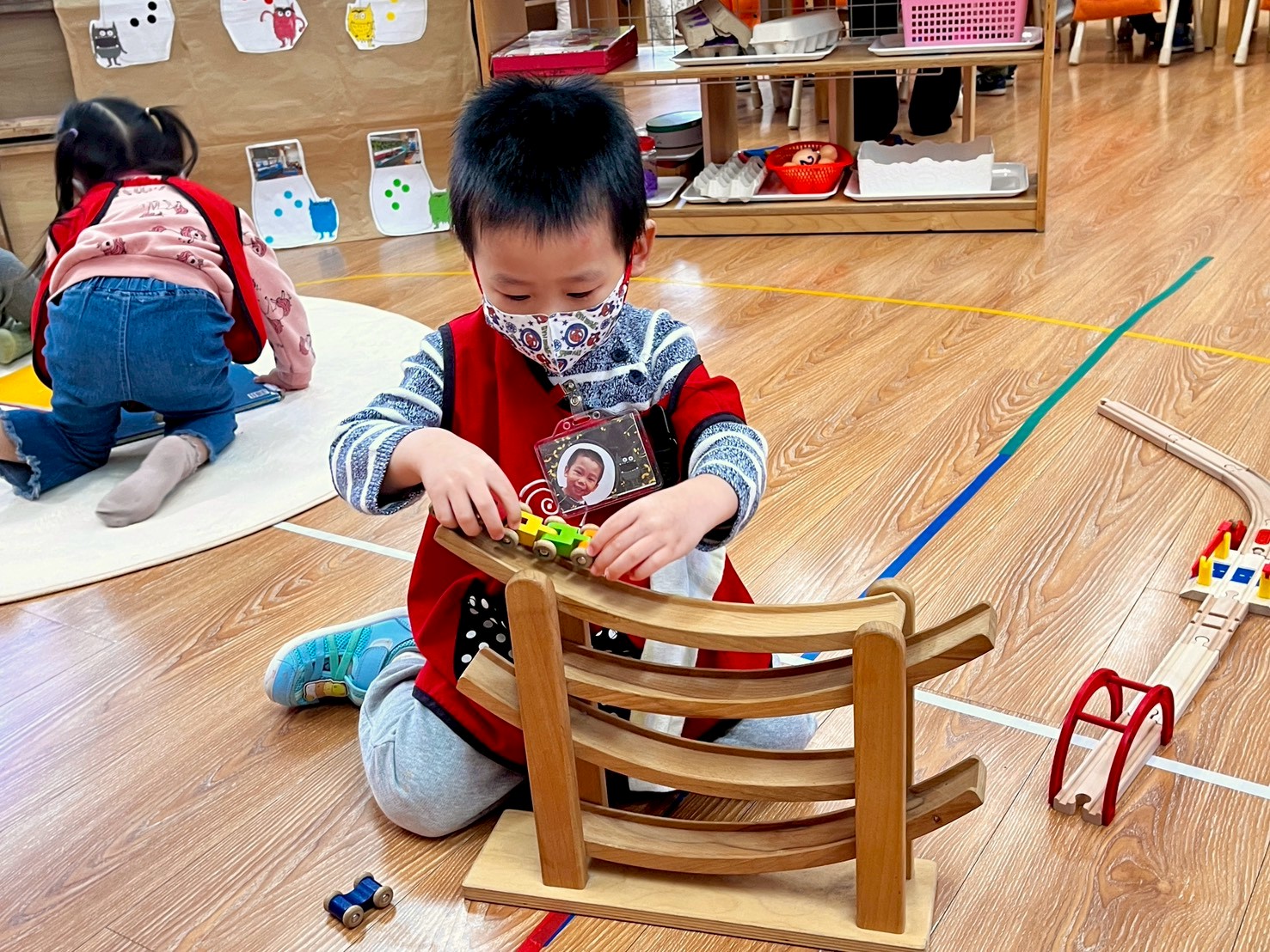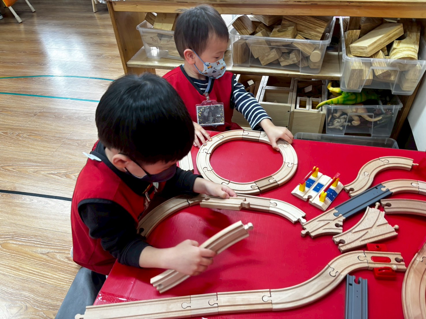 在積木區中,幼兒運用拼裝軌道進行建構,嘗試組合不同走向的軌道與圓形路線,探索連接與排列的方式。活動中可觀察孩子是否能專注完成作品、嘗試調整失敗的拼法,並在操作中表達自己的想法。教師透過示範連接方式、簡化拼裝步驟與口語引導,協助幼兒理解軌道方向與結構變化,同時鼓勵孩子與同儕一起討論、輪流操作與分享完成的軌道作品,培養合作能力與建構自信。