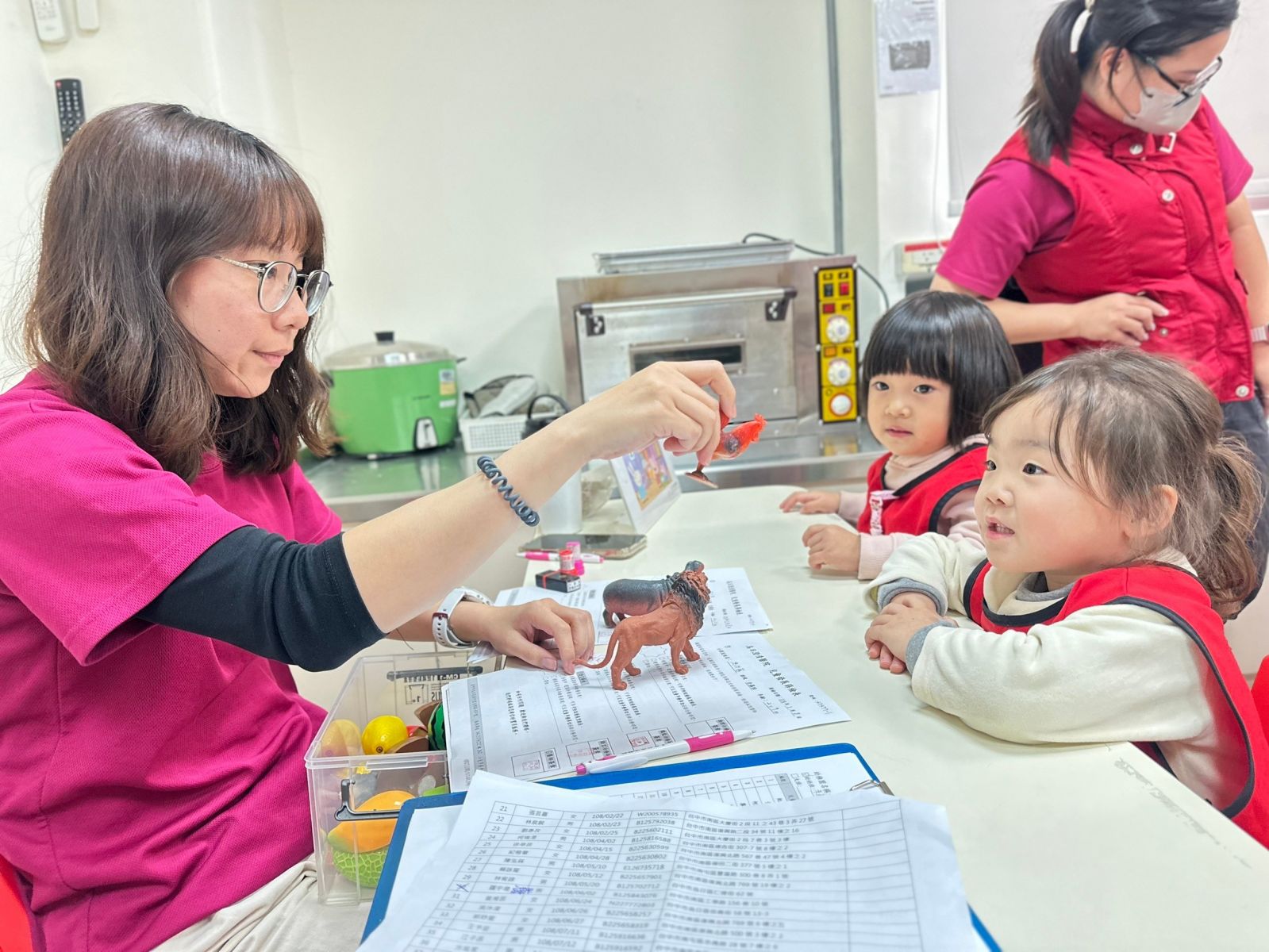 活動內容:結合社區醫療資源"中山醫藥大學語言與聽力治療學系",以專業的語言治療師與聽力系學生,提供免費語言與聽力方面的專業人員到學校,一對一的使用遊戲的方式與孩子們互動,評估兒童之發展狀況是否與實際年齡發展相符合,也可讓家長們了解孩子們的發展狀況,並透過此活動亦可推廣兒童健康發展的認知觀念與重要性!各班老師們亦會與治療師討論幼兒的發展狀況與需要注意事項,希望可以透過篩檢出孩子的問題所在。