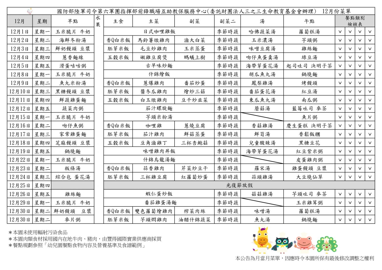 113學年度上學期12月份菜單