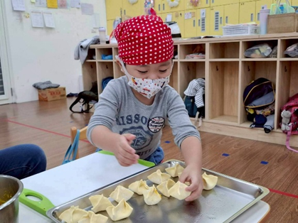 本次活動讓幼兒親手製作酥皮南瓜派。孩子們在老師與志工家長的引導下,觀察南瓜泥的顏色與質地,體驗從攪拌、包餡到壓邊的製作過程。幼兒透過實際操作提升了手部肌肉的靈活度與專注力,也在烘焙過程中感受到食物變化的樂趣。