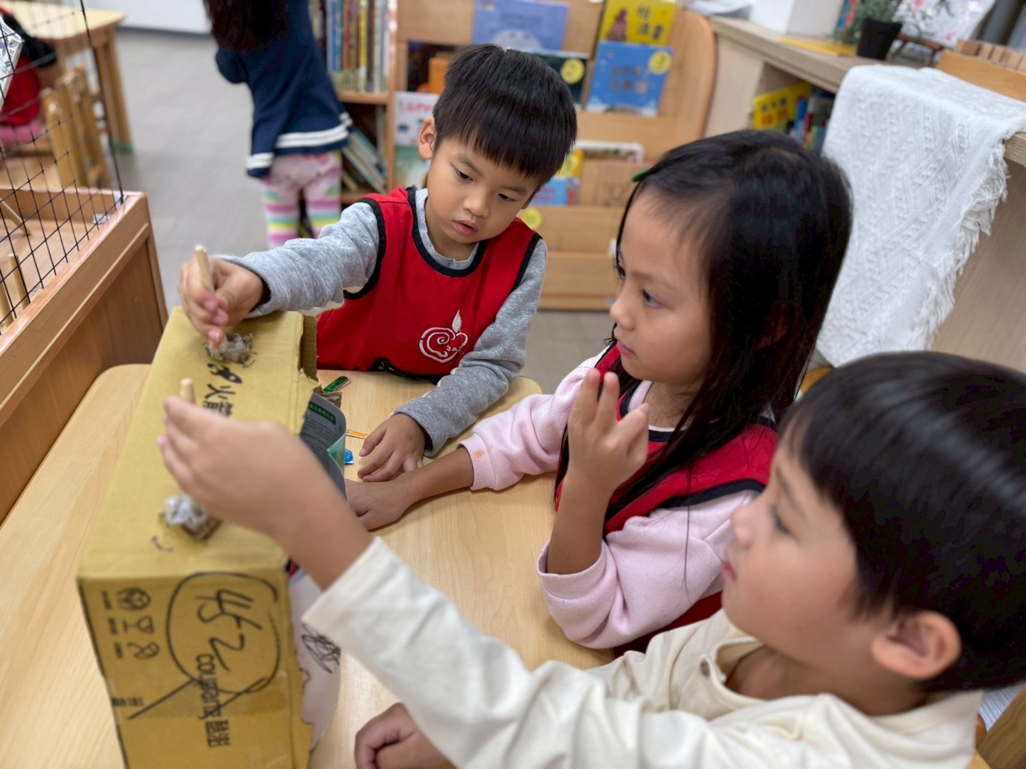 在課程活動中,老師邀請親子運用回收素材製作可玩/可動的回收 玩具,或是回收模型,並邀請幼兒將作品帶至學校與大家分享,並在分享及試玩過後,老師邀請幼兒以小組活動的方式將大家喜歡的回收玩具進行改良,也讓諾貝爾組的幼兒透過彼此與家人製作玩具的經驗一同討論製作出創新的回收玩具。
