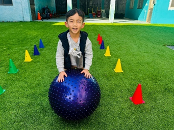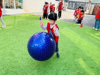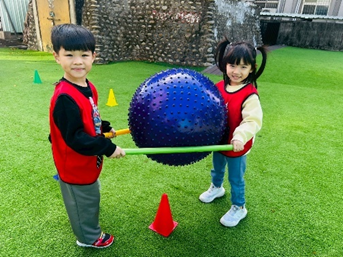 運用球及不同的道具把遊戲變有趣,幼兒走過平衡木,學習肢體控制及平衡感,抱著球過跳躍呼拉圈,增加幼兒移動性穩定度,最後運用三角錐推球行走也能增加身體協調性及手眼協調能力哦!