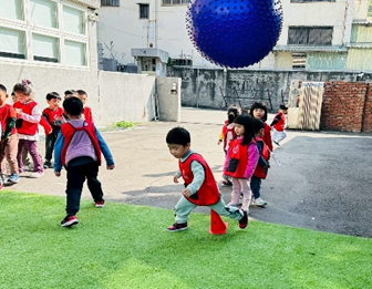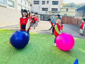 ★S行大冒險:幼兒分成兩組,分別為大中組與小中組,各組依序排好隊伍。活動開始後,由每組第一位幼兒雙手推著大龍球,沿著地面排放的三角錐以 S 行路線向前滾動,到達終點後抱著大龍球回到隊伍。完成後,將大龍球交給下一位幼兒,並回到隊伍後方排隊,依序進行。