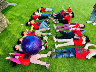 ★龍球來囉:請幼兒平躺在地面上,雙手向上伸直,將大龍球依序傳遞。