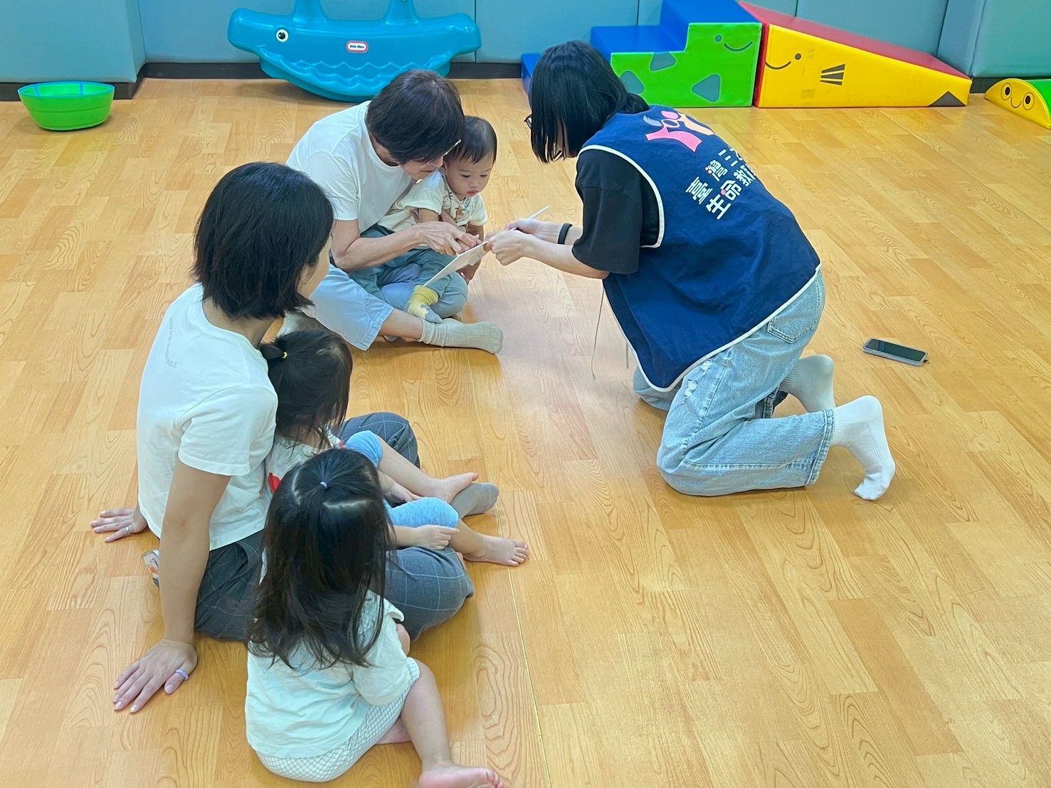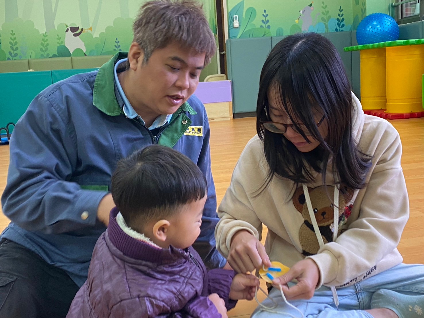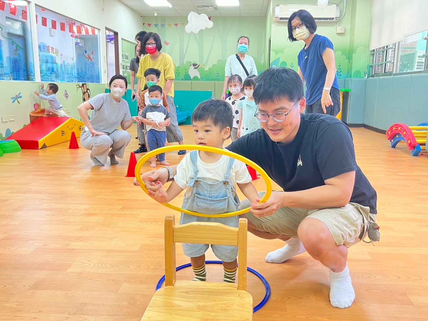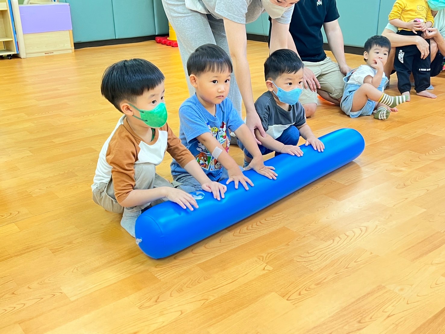 家長透過不織布一同合作將幼兒捲起來變成春捲,並且一起玩許多有趣的遊戲