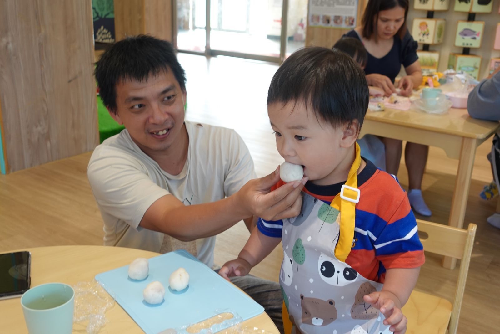 老師帶領親子一起認識中秋節的由來與月亮變化,透過月亮手指謠加深印象,接著動手製作冰皮月餅。孩子在家長陪伴下攪拌麵糰、搓揉分割,再將香甜內餡包入餅皮、用模具壓出美麗的花紋,在有趣歡樂氛圍中體驗節慶習俗,也留下甜蜜又溫馨的親子共作回憶。