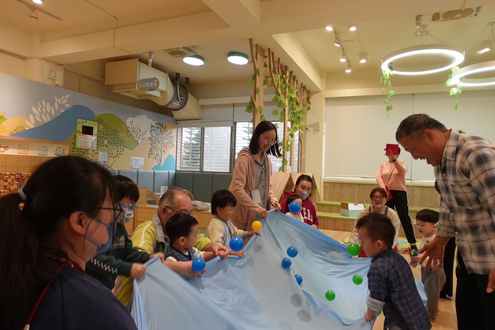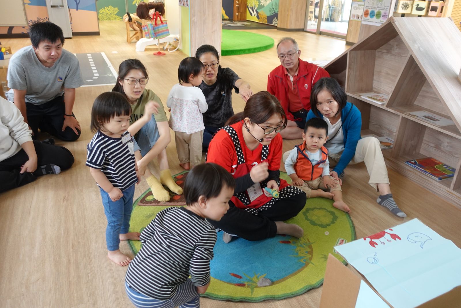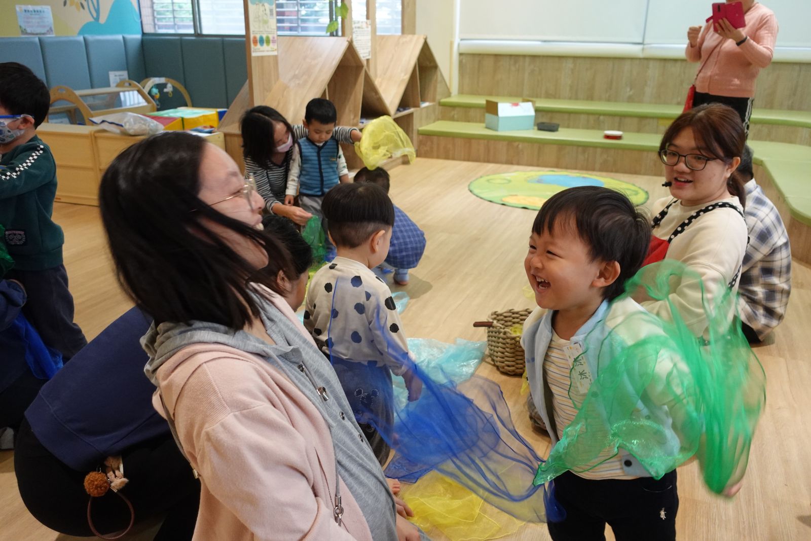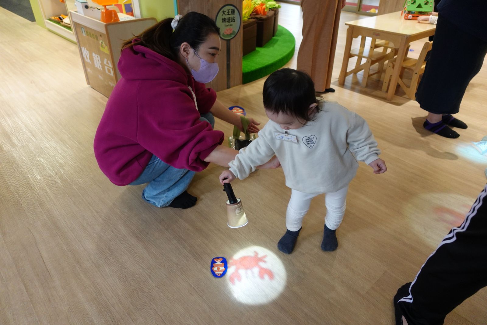 大小朋友跟著老師一起聆聽故事手電筒中螃蟹找夥伴的故事,接著親子們用手電筒在地上投影、尋找海洋動物小夥伴。大家再一起玩海洋球滑溜布,數著123拋接像放煙火般,最後拿著紗巾模仿海洋動物隨音樂律動,有的孩子變身成企鵝、有的變成章魚,親子在遊戲與肢體探索中享受充滿動感與笑聲的親子海洋時光。