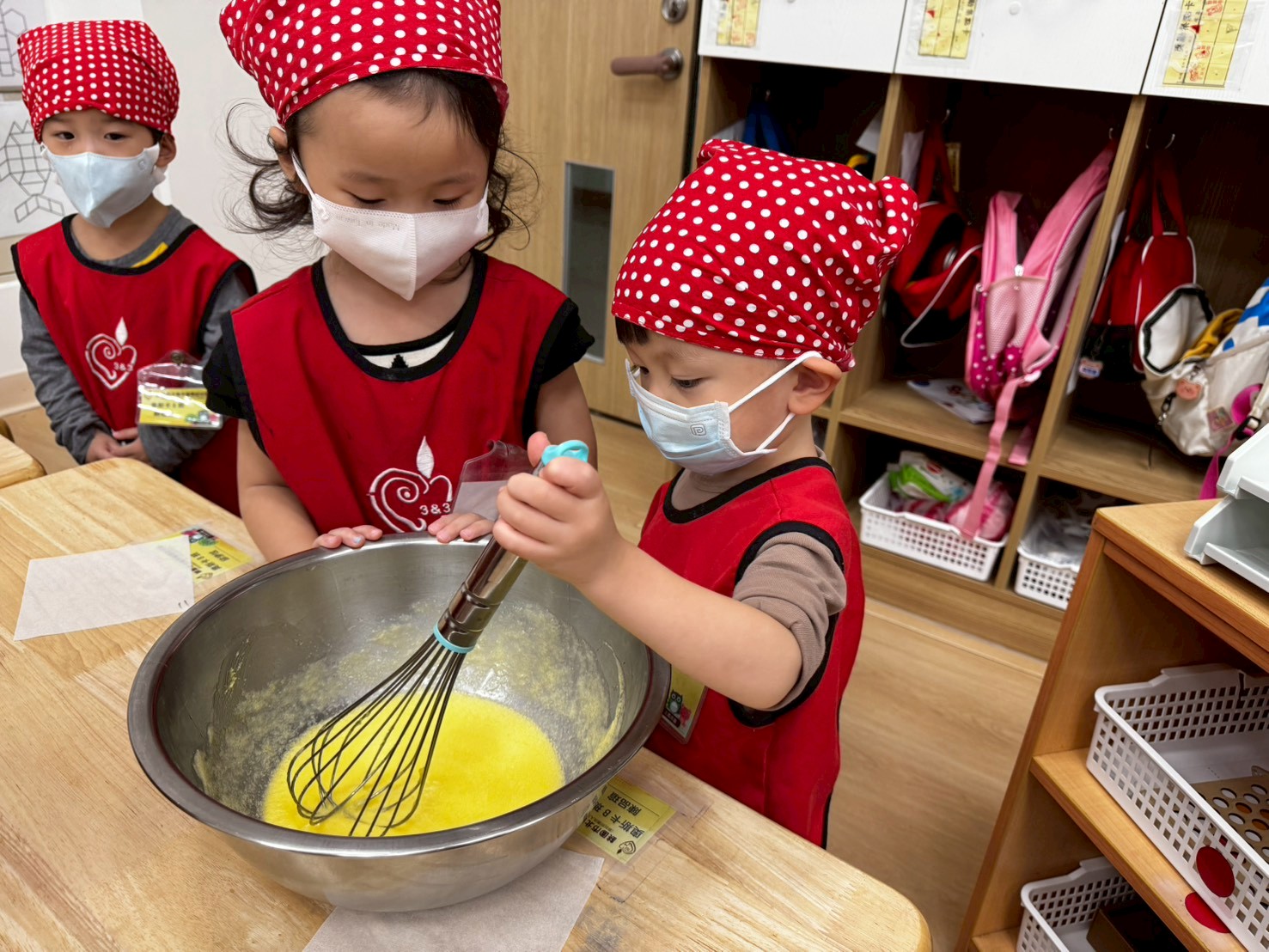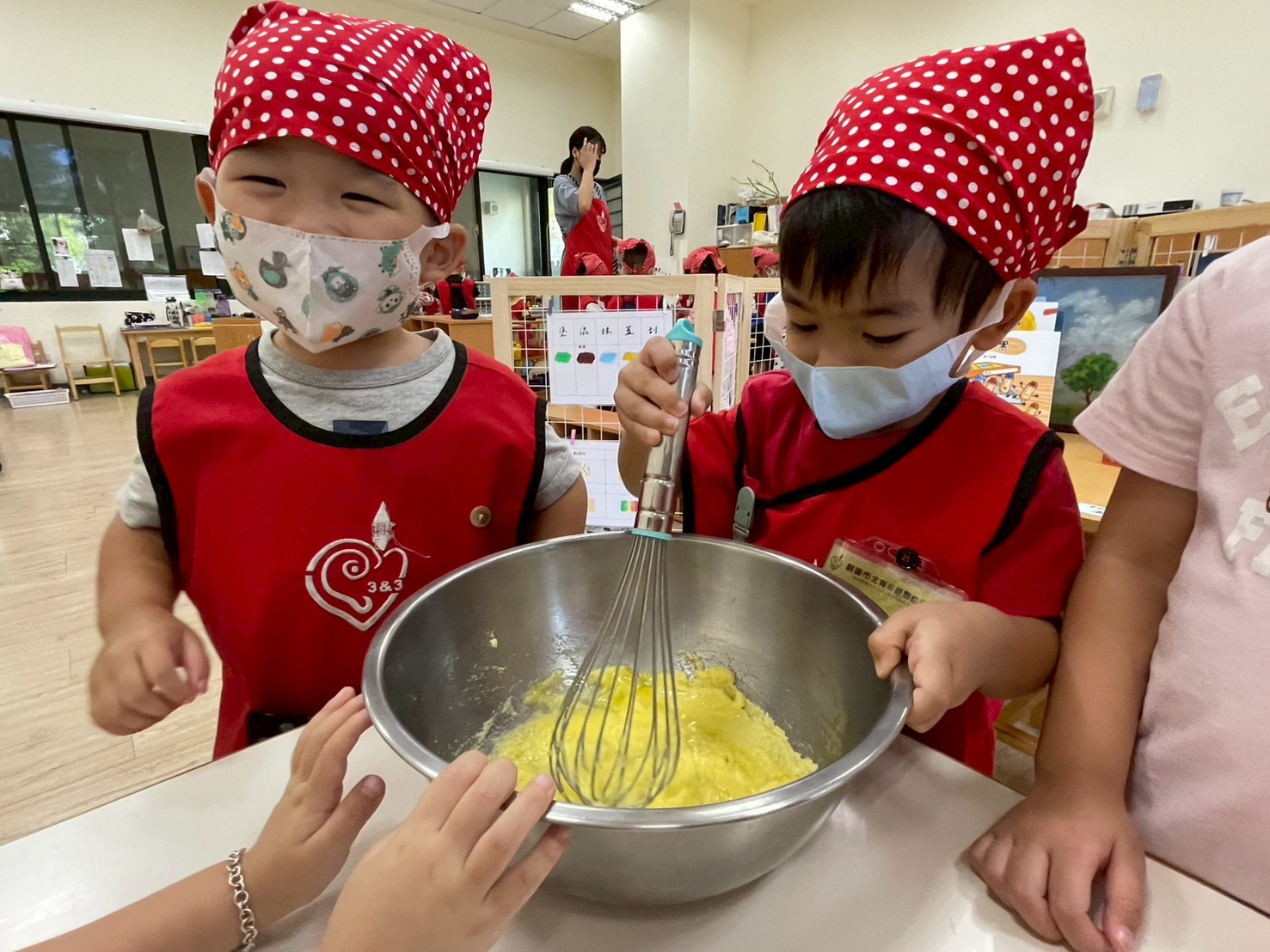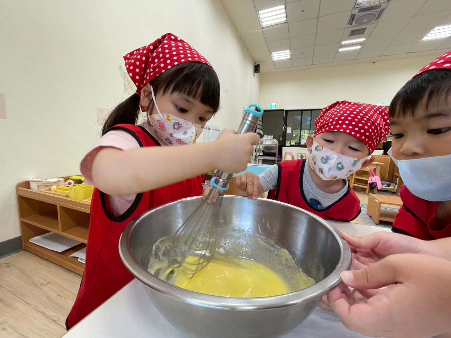這個月我們一起動手做雞蛋糕,學習食材名稱與步驟,透過攪拌麵糊、倒入模型,體驗烘焙樂趣。