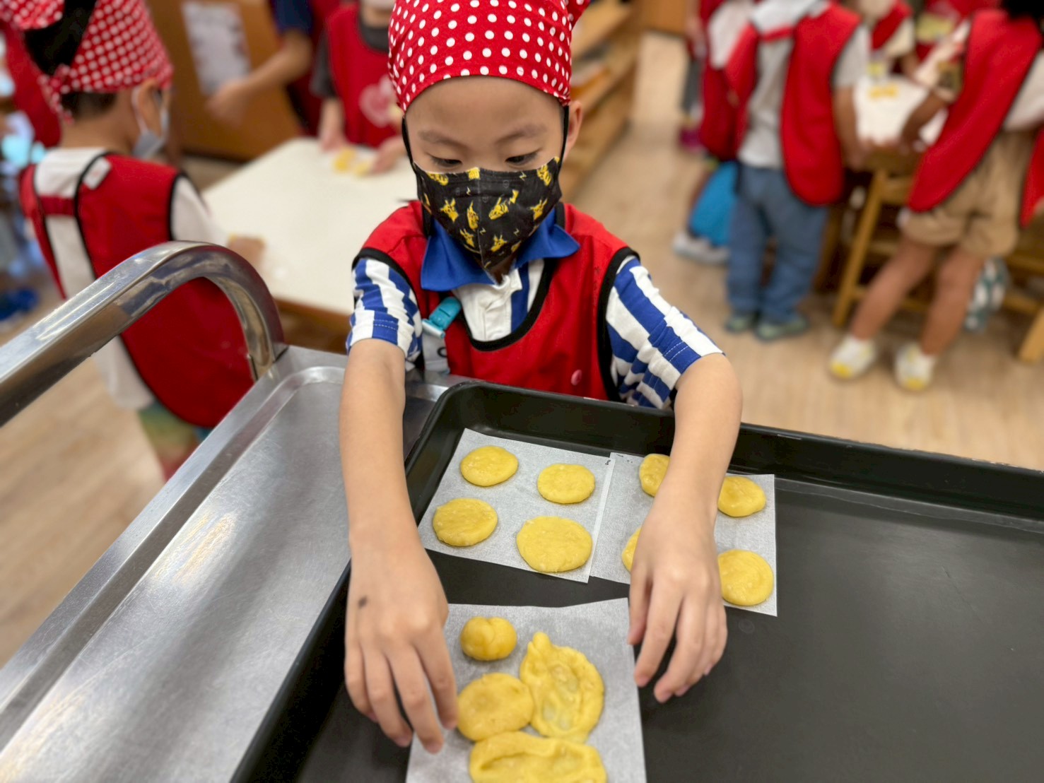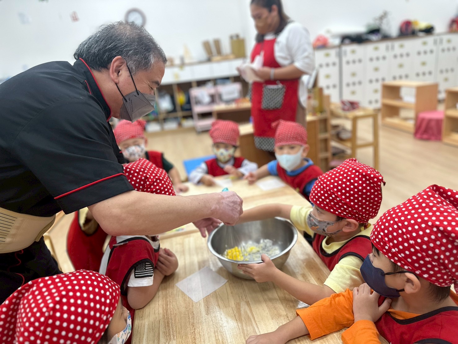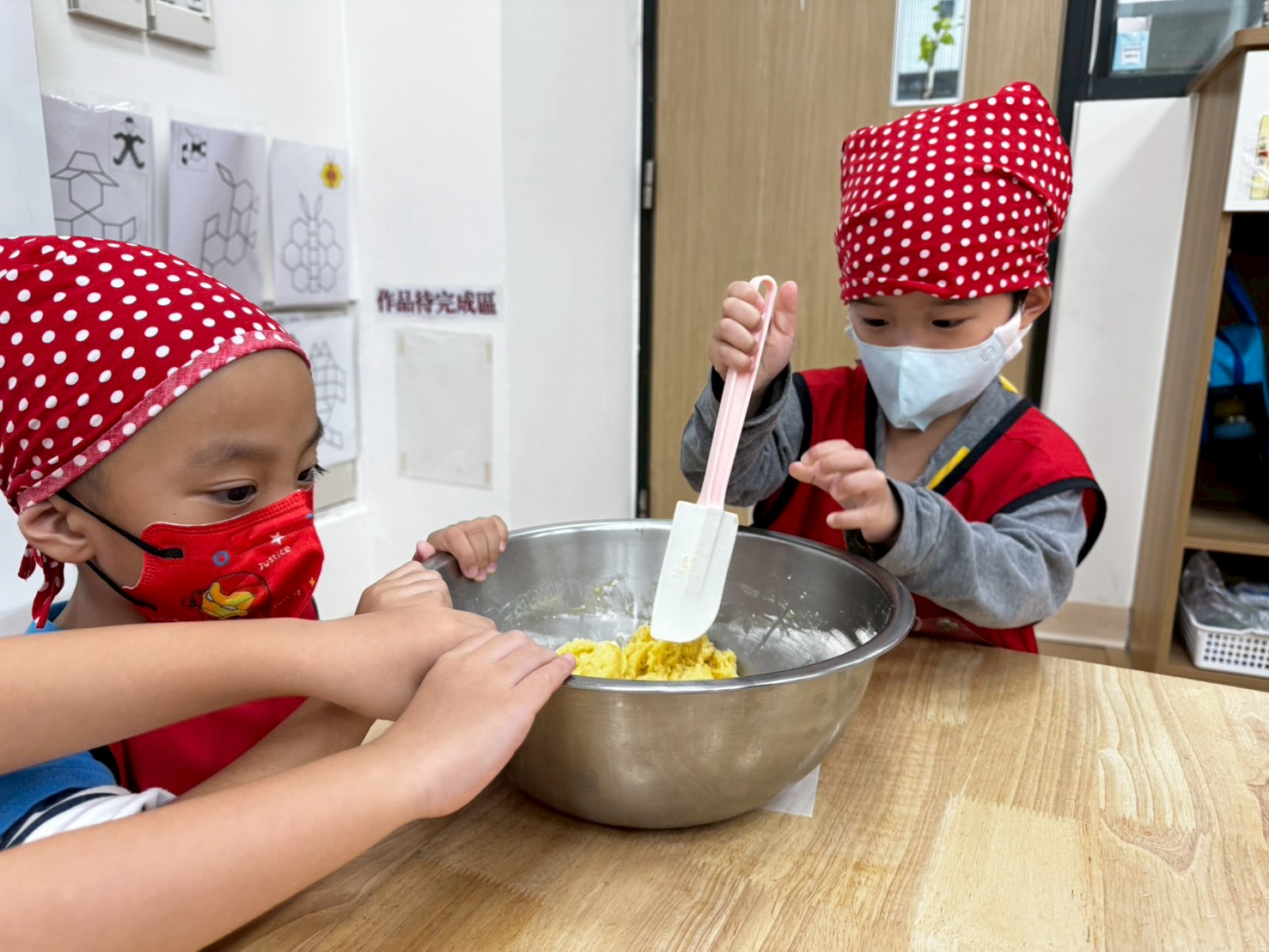 這個月我們一起動手做雞蛋糕,學習食材名稱與步驟,透過攪拌麵糊、倒入模型,體驗烘焙樂趣。