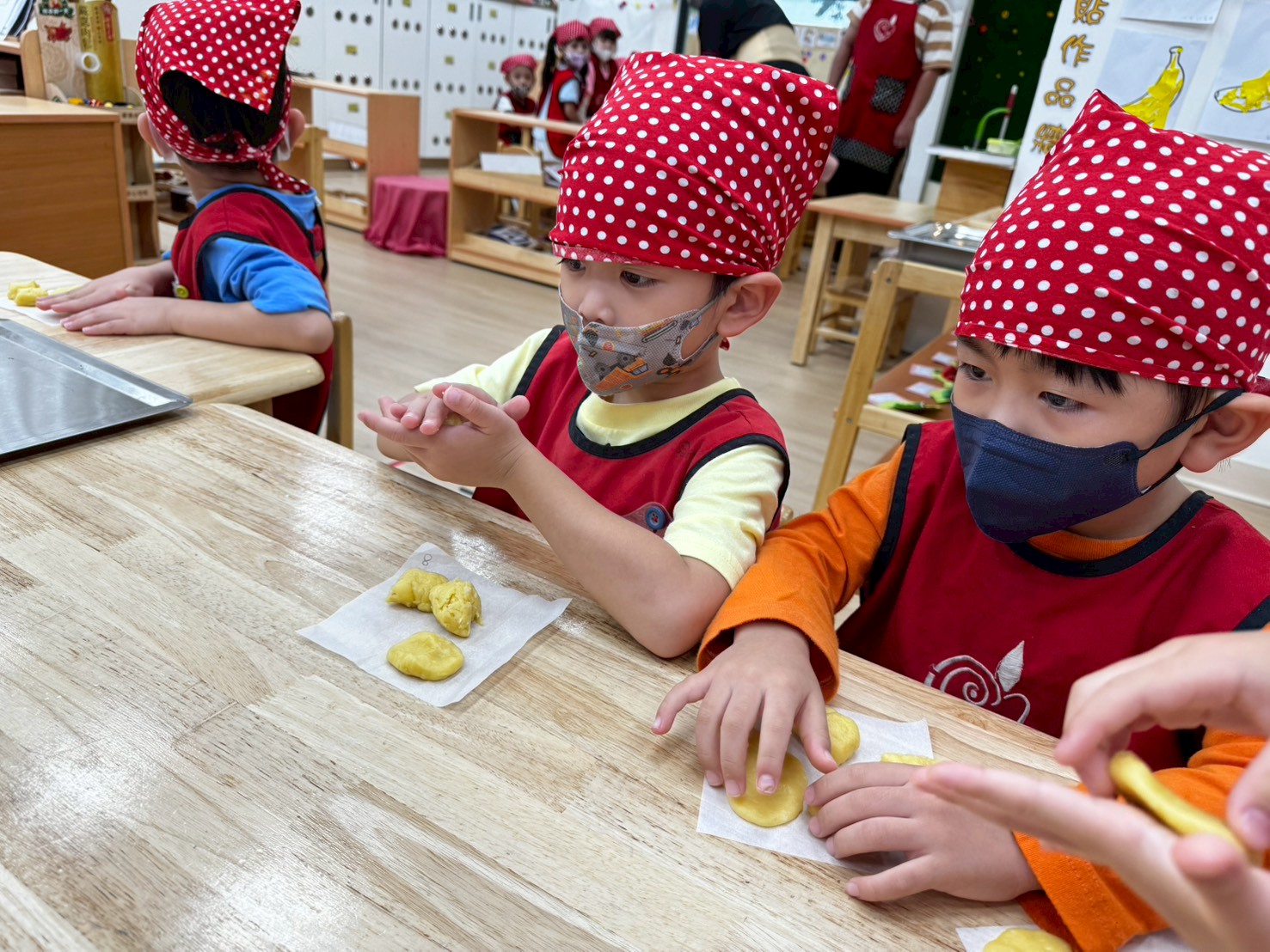 這個月是月圓人團圓的中秋節~所以由廚師叔叔帶領孩子做鳳梨酥,