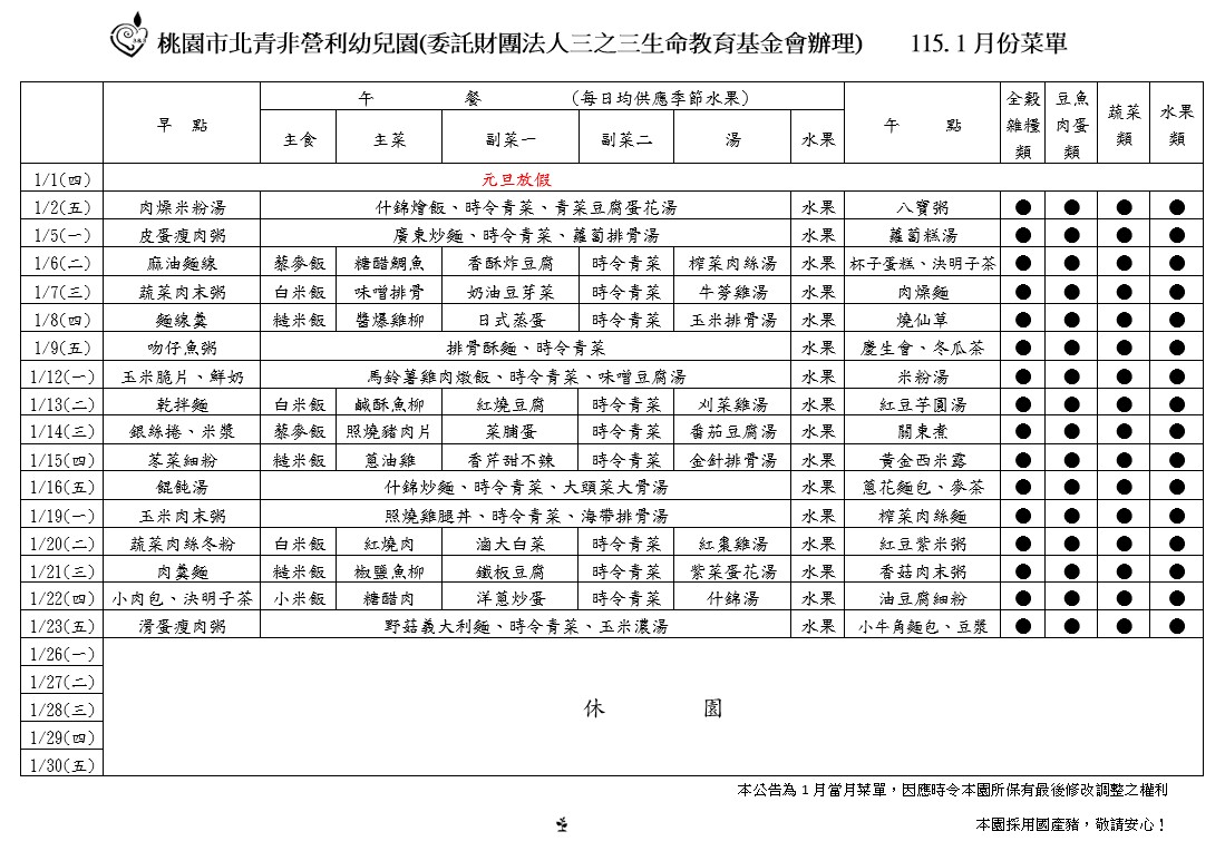 1月餐點表
