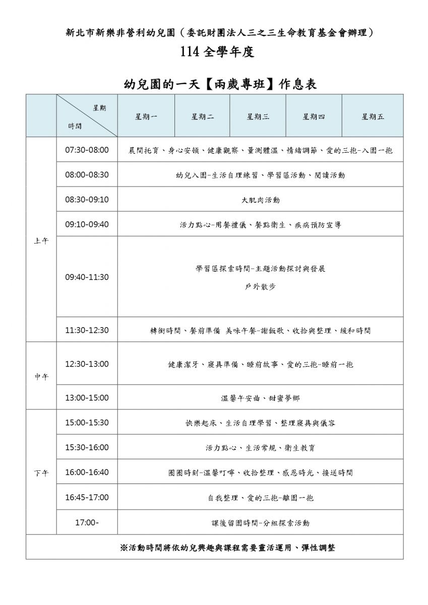 一日作息表 【2歲專班】PDF檔下載 ☞ 下載請點我