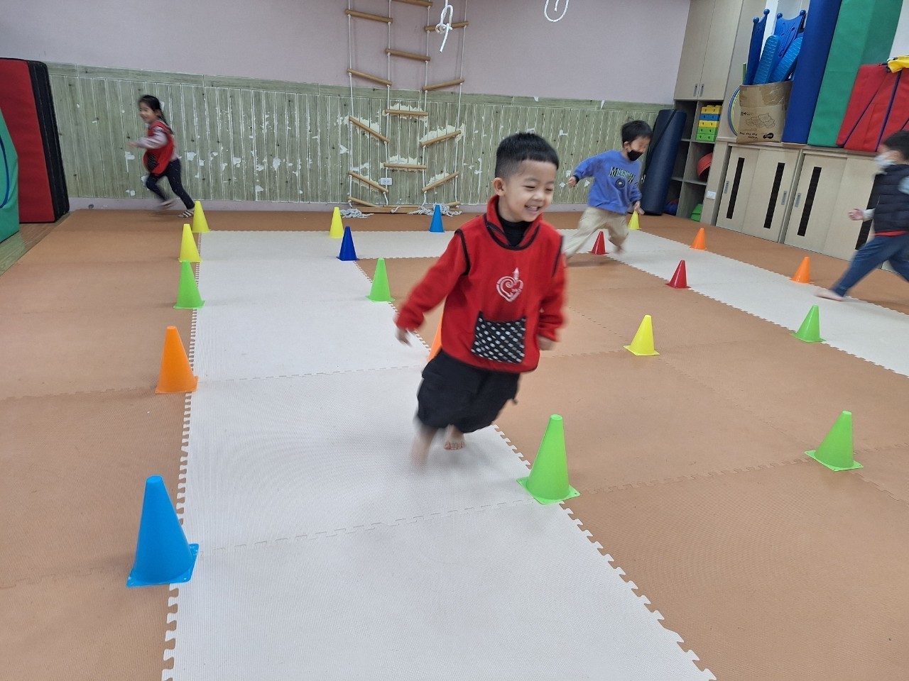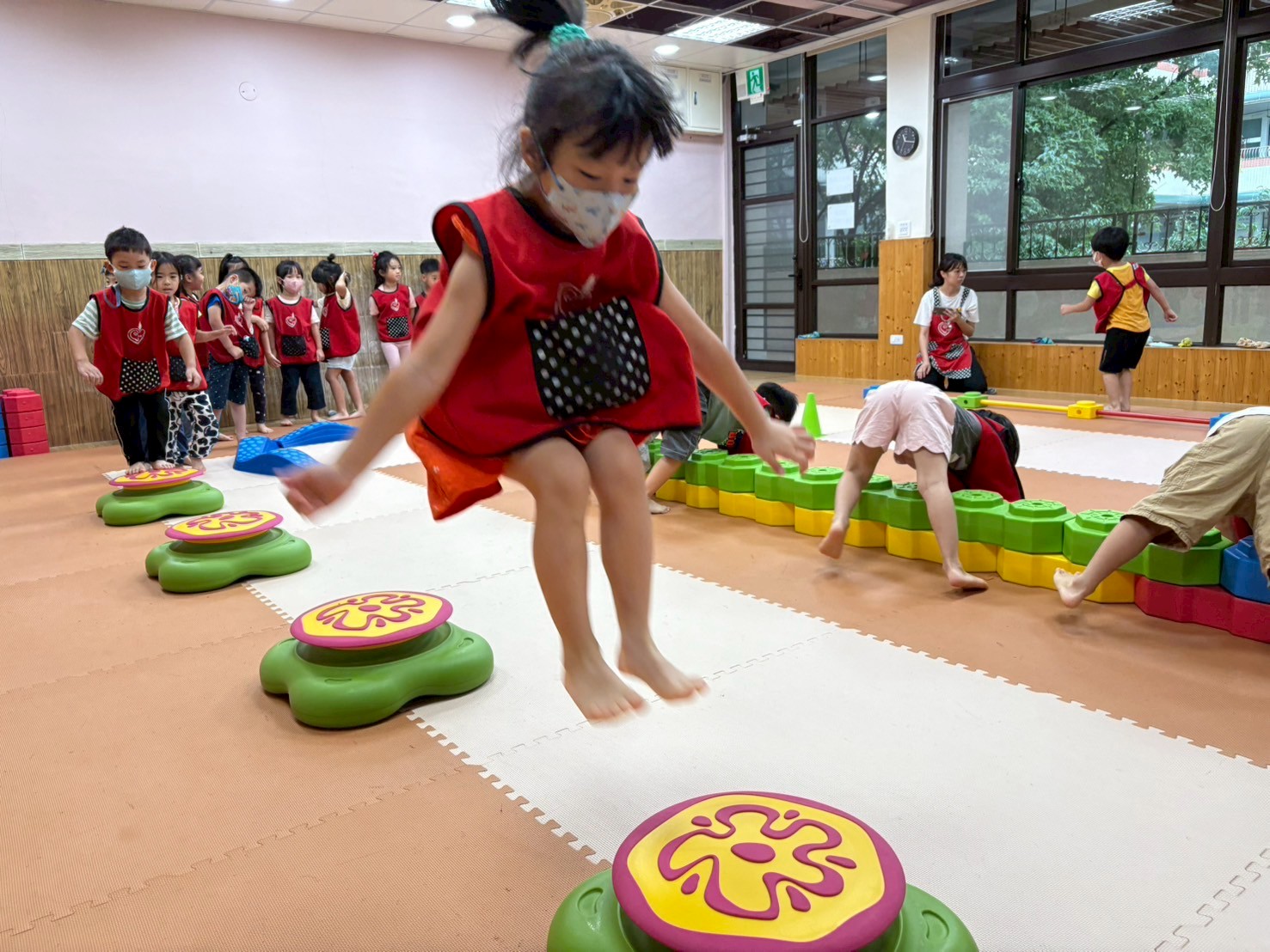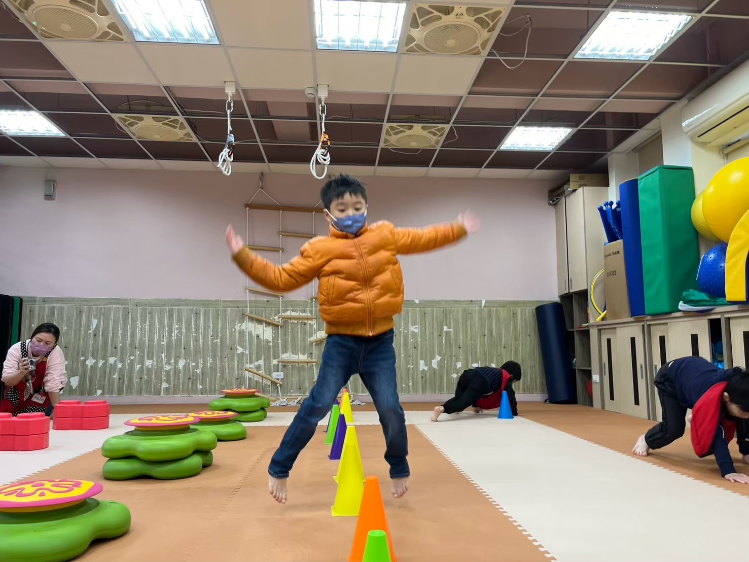 學期尾聲孩子們的爆發力增長許多,陪伴孩子挑戰難度較高的雙腳跳任務來更加提升審體的爆發力唷!