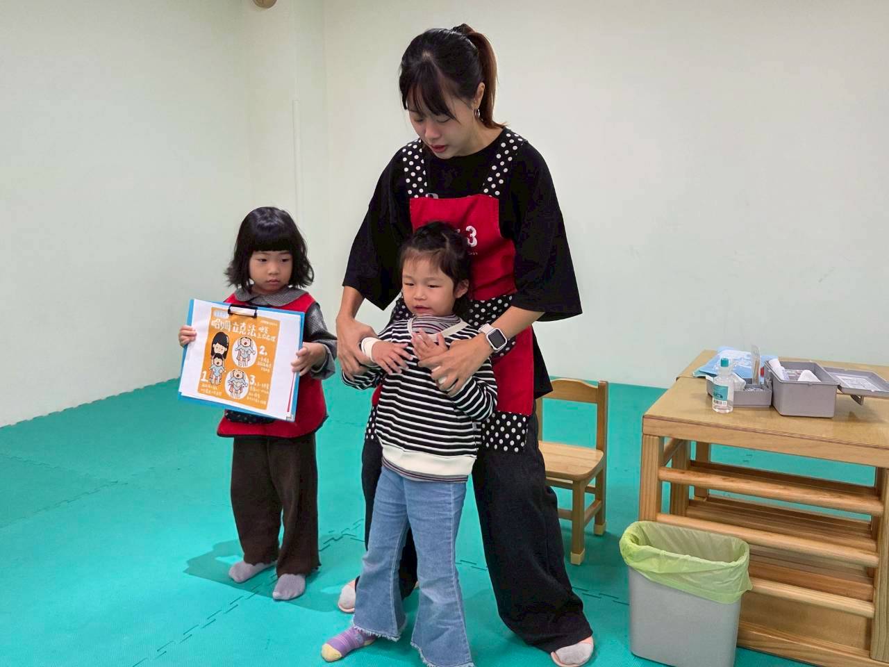 異物梗塞為常見的意外傷害,透過演練方式引導幼兒遇到此狀況時該如何自救及向成人求救
