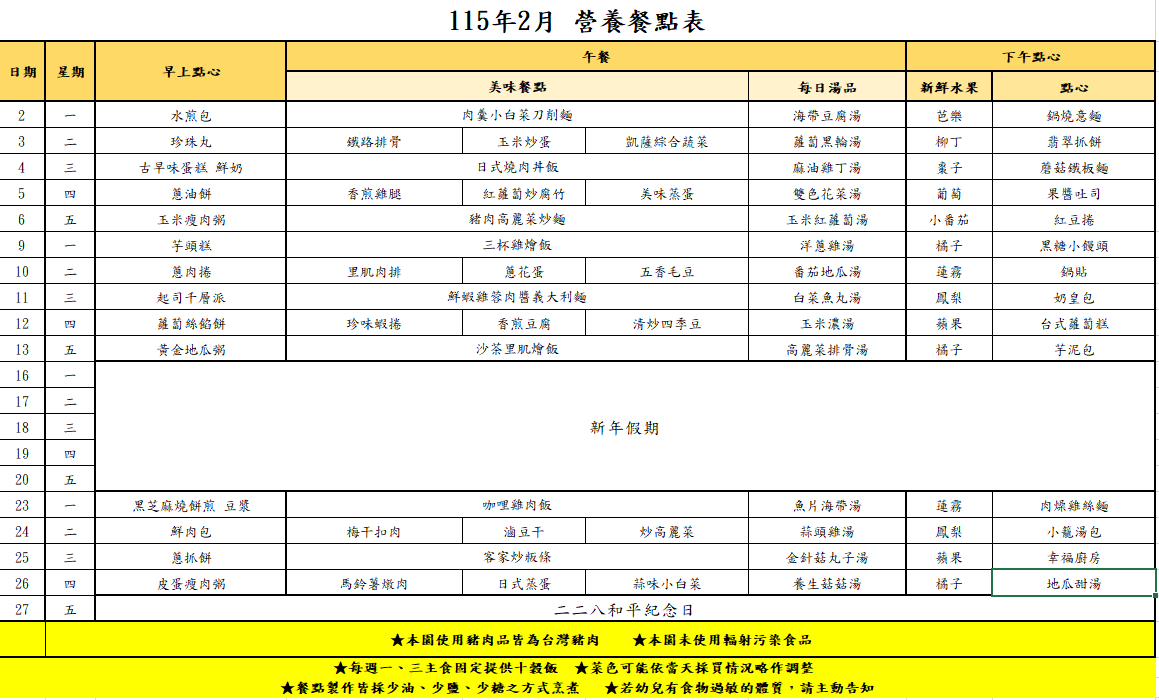 115年2月 營養餐點表
