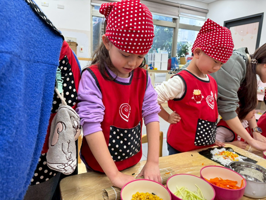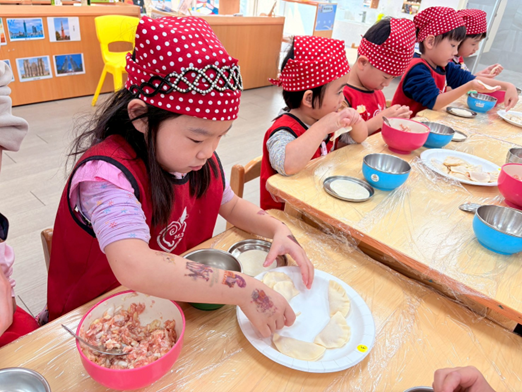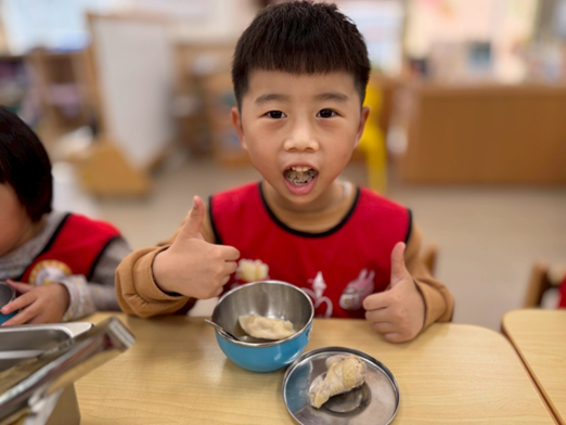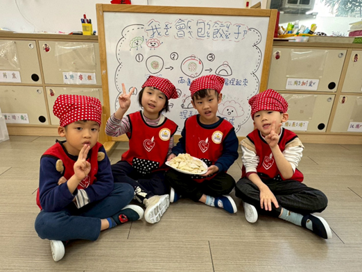 帶領幼兒透過舀餡、對折餃子皮及捏緊邊緣等動作,練習手部精細動作與手眼協調能力,並在活動尾聲,邀請幼兒一同享用體驗過年圍爐氛圍,讓幼兒在新年團聚的氣氛中,培養對食物製作的興趣。